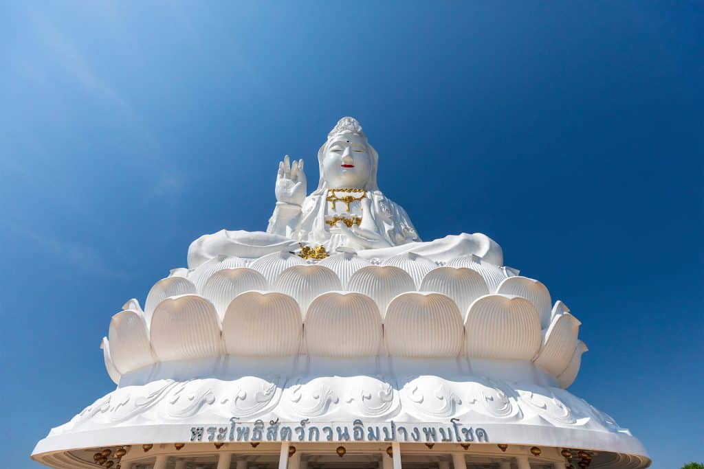 รูปปั้นพระโพธิสัตว์กวนอิม ถือเป็นองค์เจ้าแม่กวนอิมขนาดใหญ่ที่สุดในประเทศไทย มีความสูงประมาณ 79 เมตร ภายในองค์เจ้าแม่กวนอิมสามารถขึ้นลิฟต์เพื่อชมวิวจากมุมสูงได้ ผนังด้านในเป็นลวดลายปูนปั้นสวยงาม