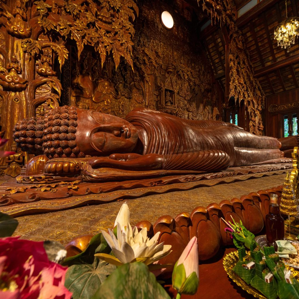 มีไฮไลท์คือ พระธาตุห้ายอด เจดีย์ที่บรรจุพระเกศาธาตุของสมเด็จพระสัมมาสัมพุทธเจ้า พระนอน (ปางปรินิพพาน) พระยืน (ปางจงกรมแก้ว) ที่สร้างจากไม้จำปี วิหารหลังใหญ่ทำจากไม้สักทั้งหลัง หอไตร บ้านโบราณ บันไดพญานาค ฯลฯ