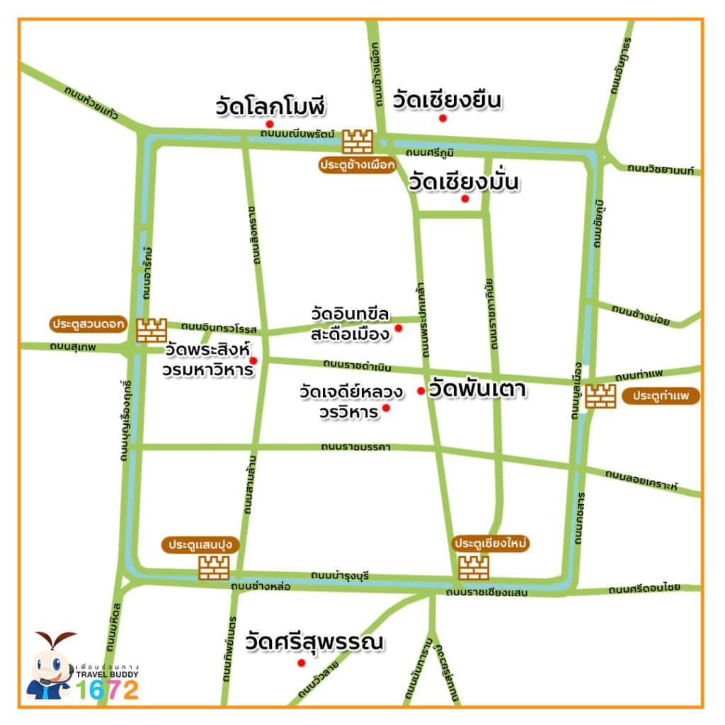 - พิกัดทั้ง 8 วัด ทั่วบริเวณคูเมืองตามเส้นทางของบัดดี้มีดังนี้