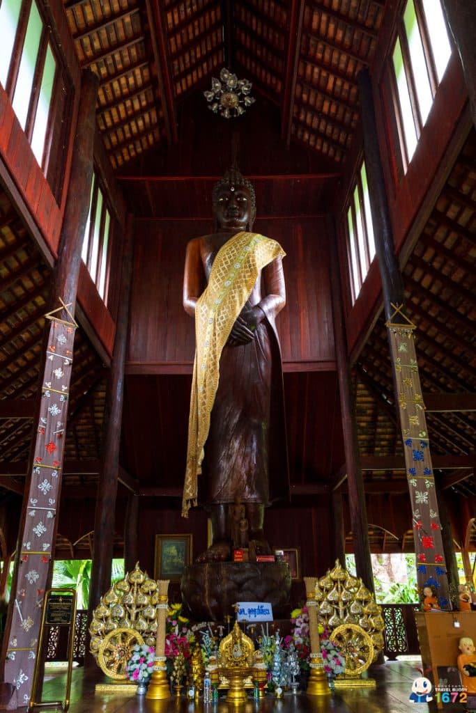 ⭐ อุโบสถพระยืน ภายในประดิษฐานพระพุทธรูปไม้ปางจงกรมแก้ว ความสูง 9 เมตร แกะสลักมาจากต้นไม้ใหญ่เพียงต้นเดียว