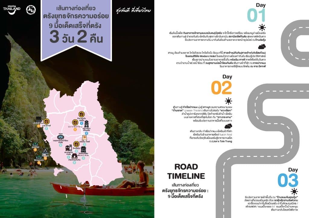 บัดดี้ชวนเที่ยวตามรอย 9 มื้อเด็ดเสร็จที่ตรัง นำเสนอแผนการเดินทางท่องเที่ยว 3 วัน 2 คืน พาตะลุยแหล่งท่องเที่ยวดังรวมทั้งร้านเด็ด อิ่มอร่อยจุใจ