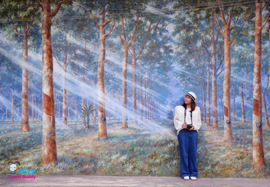 จากปากซอย เดินเข้ามาเพียงแค่ 100 เมตร จะเจอกับภาพเขียน “ต้นยางพารา” ตามประวัติการปลูกต้นยางพาราในไทยนั้น พบว่าปลูกครั้งแรกที่จังหวัดตรัง โดยเป็นการนำเมล็ดเข้ามาปลูก ปัจจุบัน ต้นยางรุ่นแรกของไทยเหลือเพียงต้นเดียวที่บริเวณถนนตรังคภูมิ อำเภอกันตัง