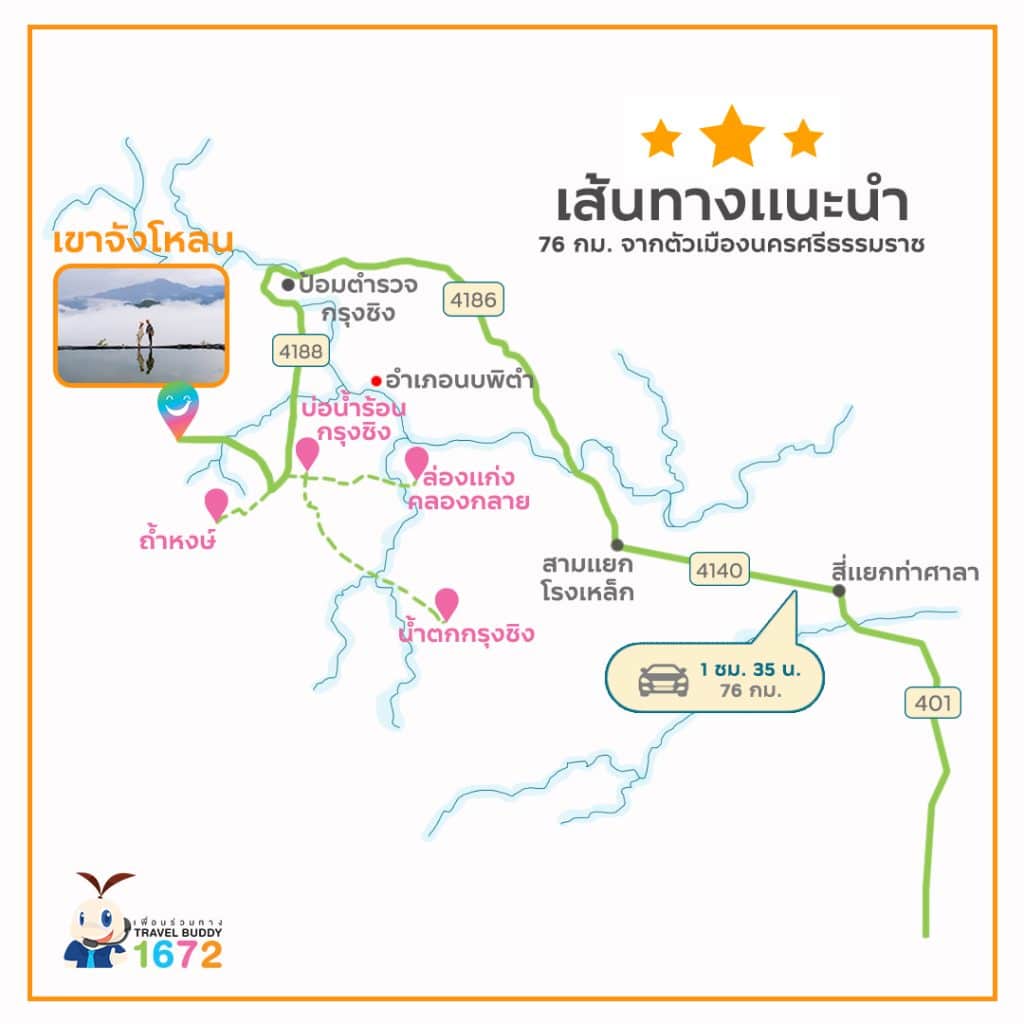 จากตัวเมืองฯ ใช้ถนนหมายเลข 401 มุ่งหน้าไปทางอำเภอท่าศาลา จากนั้นเลี้ยวซ้ายตรงสี่แยกท่าศาลา เข้าสู่ถนนหมายเลข 4140 ขับไประยะทางประมาณ 21 กม. ให้เลี้ยวขวาบริเวณสามแยกโรงเหล็ก เข้าสู่ถนนหมายเลข 4186 ขับไปตามเส้นทาง ระยะทาง 16.5 กม. ให้เลี้ยวซ้ายบริเวณสี่แยกป้อมตำรวจกรุงชิง เข้าสู่ถนน 4188 ขับต่อไปอีก 6.5 กม. ก็จะถึงจุดขึ้นรถนำเที่ยวไปที่เขาจังโหลน