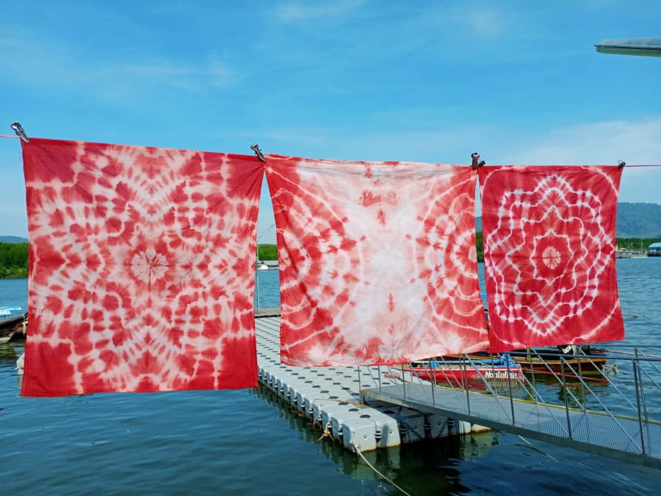 ผ้ามัดย้อมที่นี่ไม่ได้ใช้สีเคมีนะคะ แต่ใช้สีย้อมจากต้นตะบูนและต้นโปรงแดง ที่ขึ้นอยู่ในป่าชายเลนของหมู่บ้านนี่เอง