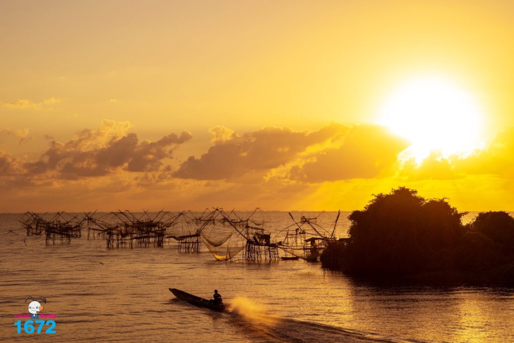อีกหนึ่งภาพคุ้นชินของปากประ ที่พบเห็นได้ทุกวันยามเช้าตรู่ก่อนพระอาทิตย์ขึ้น คือเรือของนักท่องเที่ยวที่พร้อมใจกันตื่นไวกว่าตอนอยู่บ้าน เพื่อมาเฝ้ารอชมความงามยามแสงสีส้มแดงของดวงอาทิตย์ฉาบทาบขอบฟ้า โดยมียอยักษ์เป็นพร็อพสำคัญประกอบฉาก