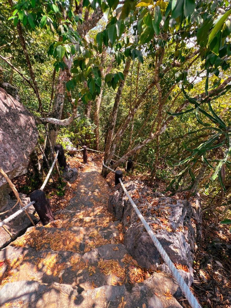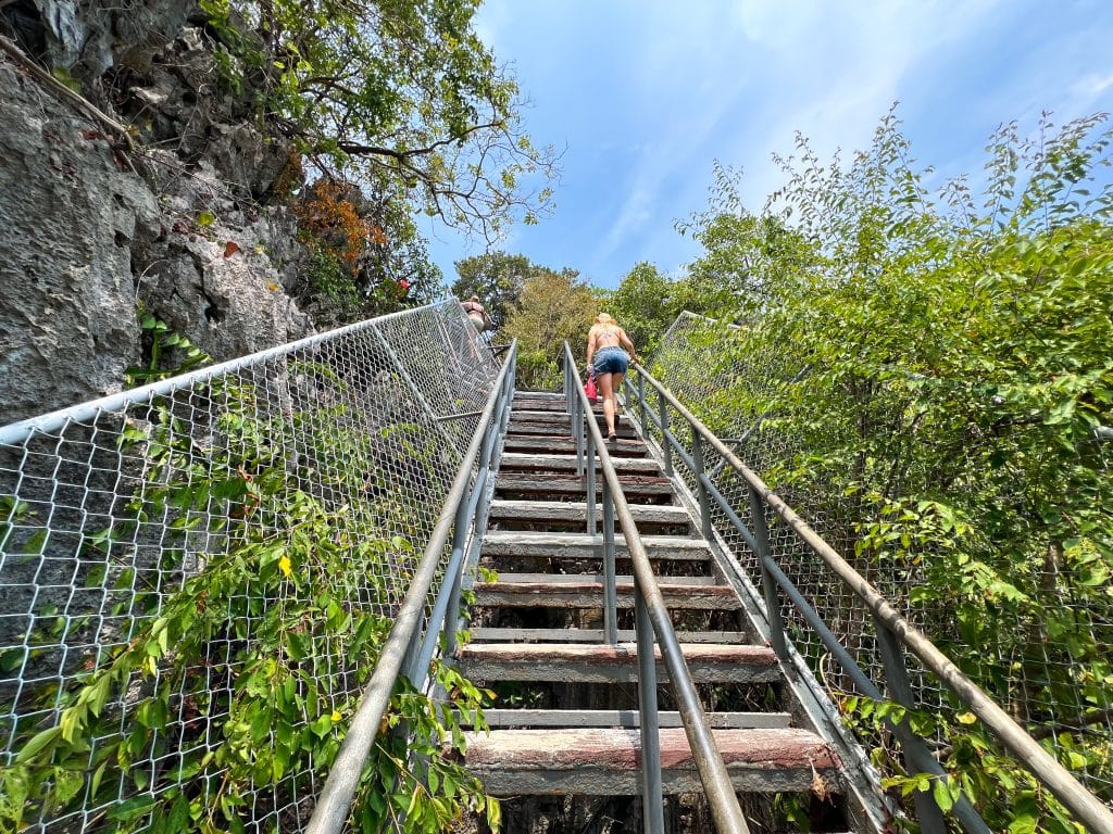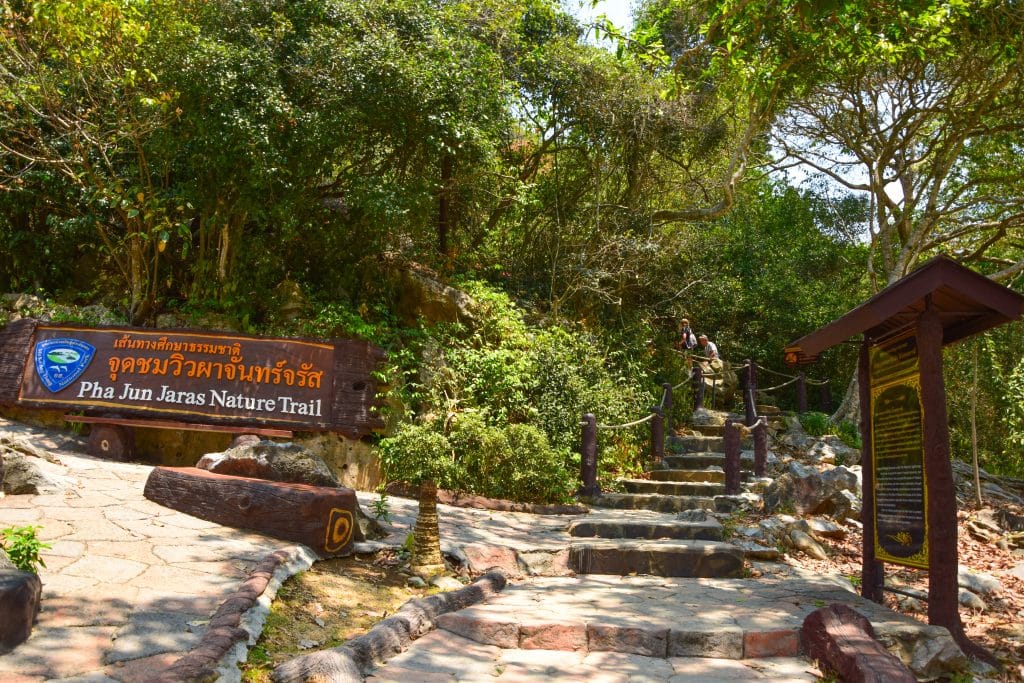 ระหว่างทางจะพบกับป่าเขาหินปูนที่มีต้นจันทร์ผา สลัดได และยอป่าเป็นพันธุ์ไม้เด่น รวมทั้งยังมีโอกาสพบค่างแว่นถิ่นใต้อีกด้วย แนะนำให้สวมรองเท้าที่กระชับข้อเท้าและกันลื่น พร้อมพกน้ำดื่มไปด้วย เพราะเส้นทางค่อนข้างชันและอากาศร้อน
