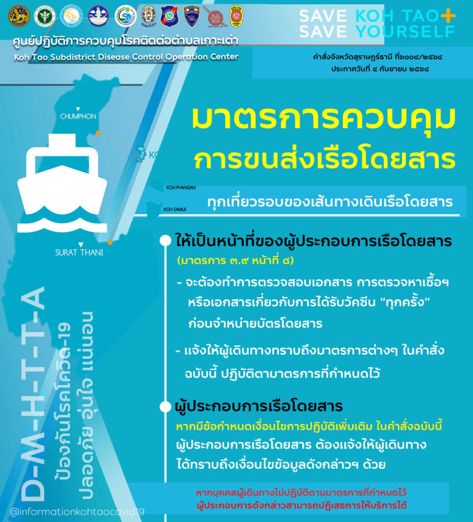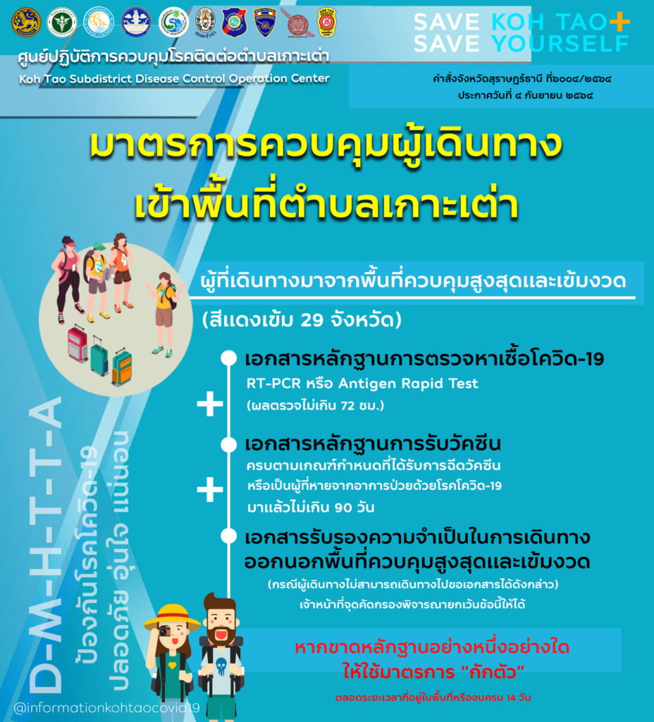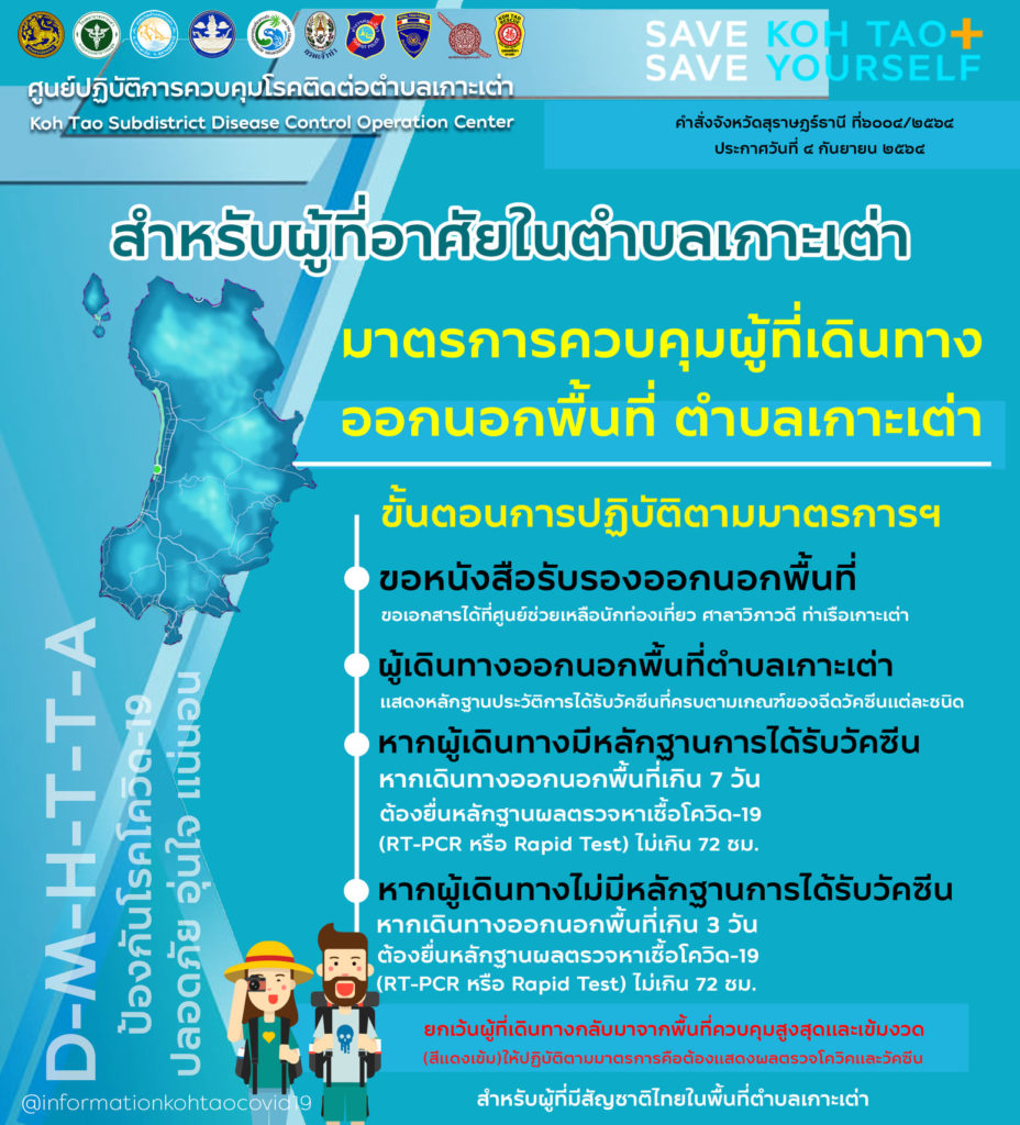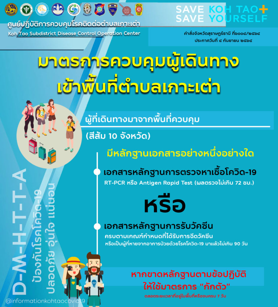 มาตรการควบคุมผู้ที่เดินทางเข้าพื้นที่ตำบลเกาะเต่า มาตรการต่าง ๆ ใช้ปฏิบัติอยู่ในปัจจุบัน ตามคำสั่งจังหวัดสุราษฎร์ธานี เรื่อง มาตรการเร่งด่วนในการป้องกันการแพร่ระบาดของโรคติดเชื้อไวรัสโคโรนา 2019 ฉบับที่ 65 พื้นที่อำเภอเกาะสมุย-อำเภอเกาะพงันลงวันที่ 3 กันยายน 2564