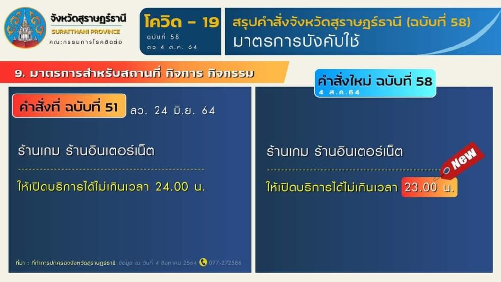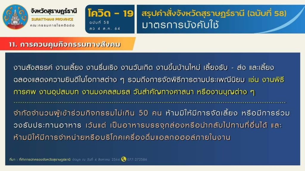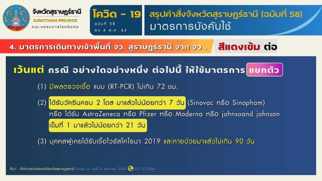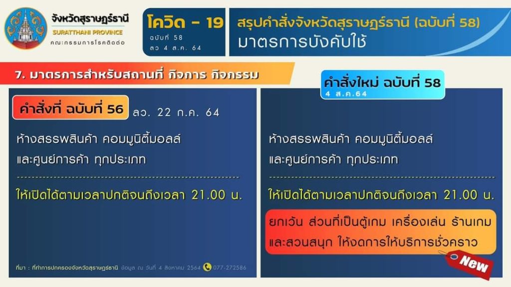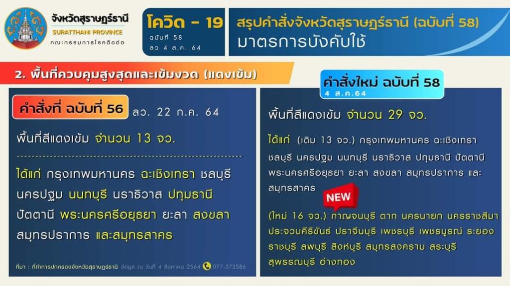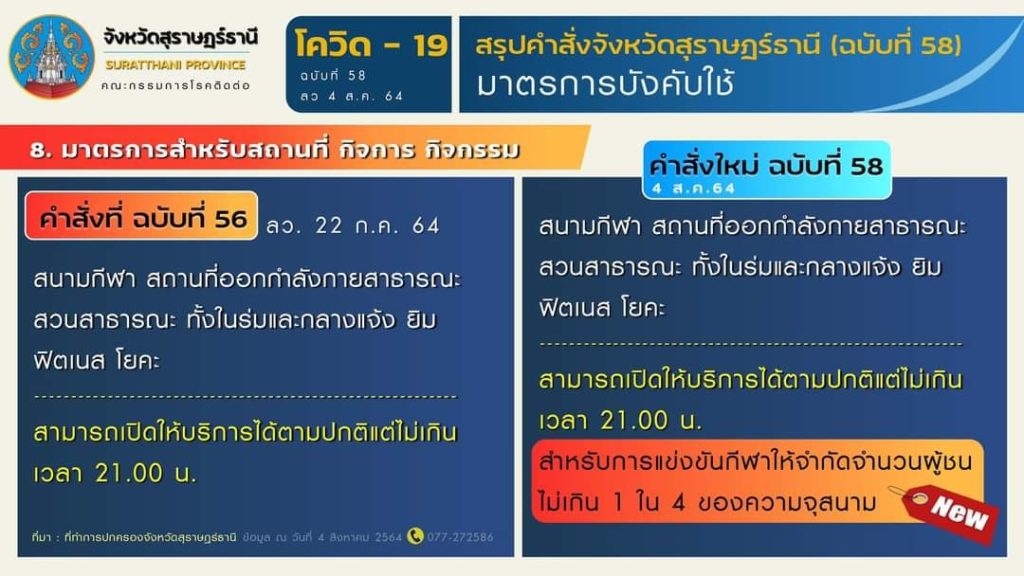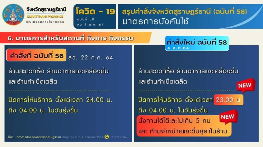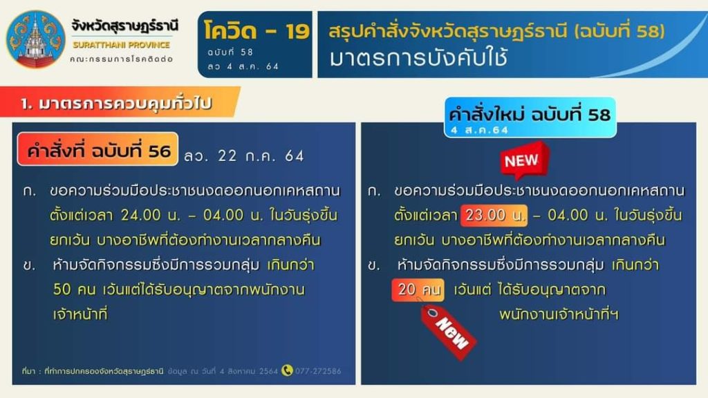 🎯 สรุปมาตรการตามคำสั่งจังหวัดสุราษฎร์ธานี (ฉบับที่ 58) ลงวันที่ 4 สิงหาคม 2564 มีผลบังคับใช้ ตั้งแต่วันที่ 5 สิงหาคม 2564 เป็นต้นไป