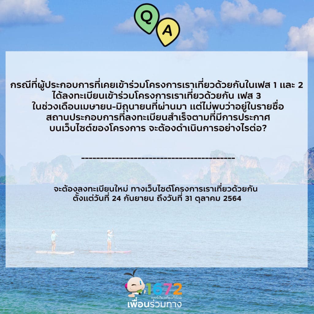 ถาม-ตอบ คลายข้อสงสัยโครงการเราเที่ยวด้วยกัน เฟส 3 EP 2โครงการเราเที่ยวด้วยกัน / By เพื่อนร่วมทาง / สถานที่ท่องเที่ยว / 05/10/2021 สำหรับเพื่อน ๆ ที่มีข้อข้องใจนอกเหนือจากที่แอดนำเสนอในบทความนี้ สามารถอ่านเพิ่มเติมได้จากบทความด้านล่างได้เลยถาม-ตอบ คลายข้อสงสัยโครงการเราเที่ยวด้วยกัน เฟส 3