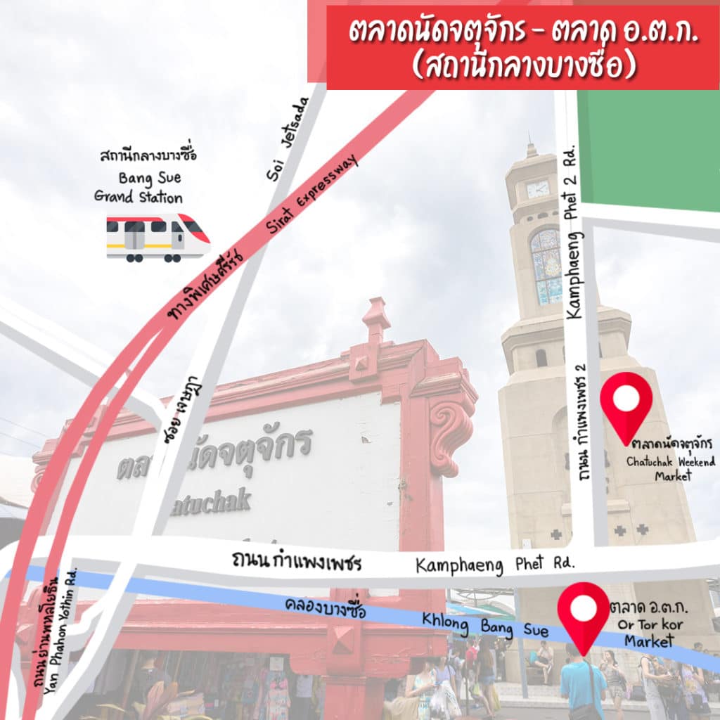 Getting there Get off at Bang Sue Grand Station and change to the MRT Blue Line to get off at Kamphaeng Phet or Chatuchak Park Station.