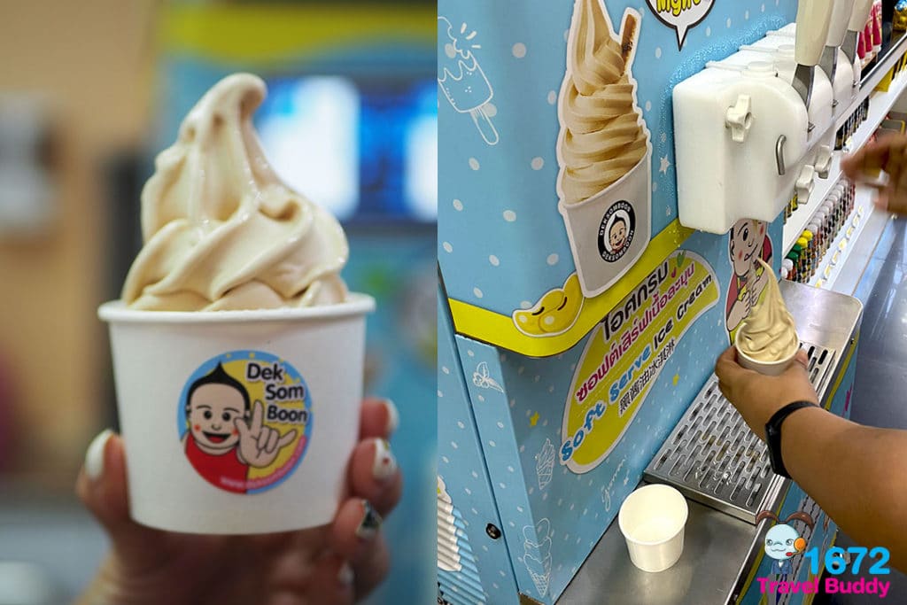 The soft serve from the famous sauce brand Deksomboon shouldn’t be missed. The ice-cream is 20 Baht a cup and available in two flavours: black soy sauce and plum sorbet. Yes, black soy sauce for a sweet treat sounds weird but you won’t regret giving it a try!
