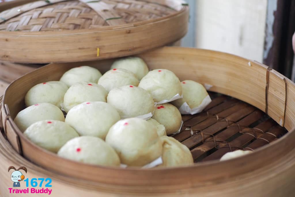 The hand-shaped buns are made from dough mixed with sweet potatoes. The price starts from 20 Baht a piece depending on the fillings.
