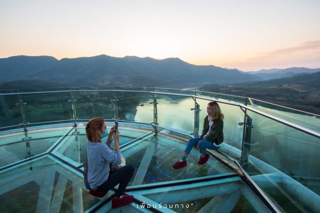 You have to take a songthaeo to reach the top of Phu Khok Ngio. The fare is 60 Baht a person and includes the price of the shoe covers required to walk on the glass bridge.