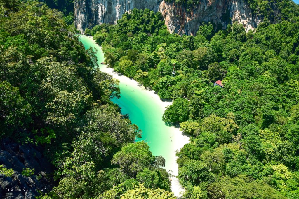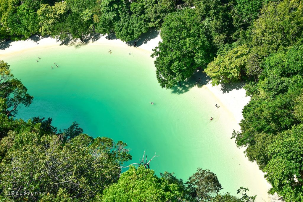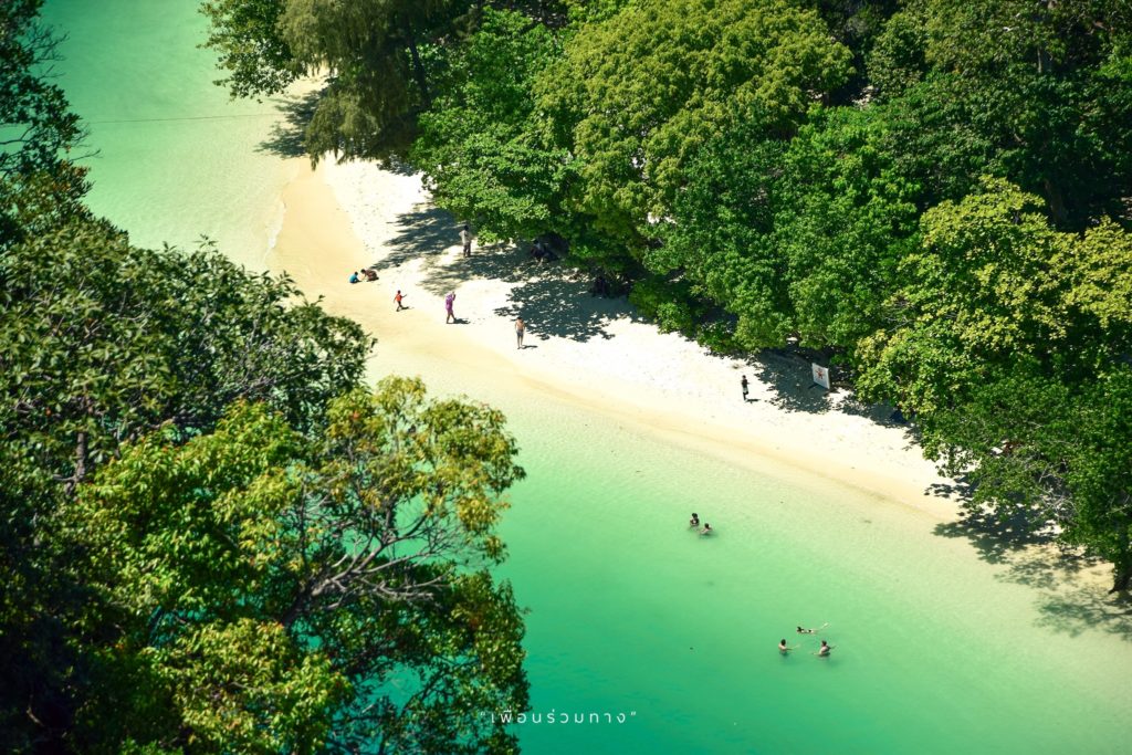 ในวันที่แดดดีและฟ้าใส เมื่อมองจากจุดชมวิวลงไปจะเห็นหาดทรายสีขาวตัดกับน้ำทะเลสีเขียวอมฟ้าสวยใส