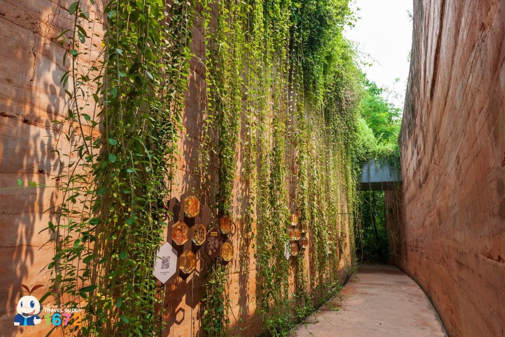 ระหว่างทางเดินมีอาคารเอนกประสงค์ มีโครงสร้างกำแพงเป็นดินบดอัด มีต้นไม้เลื้อยจากด้านบนของอาคารลงมาตามผนังให้กลมกลืนไปกับธรรมชาติอีกด้วย
