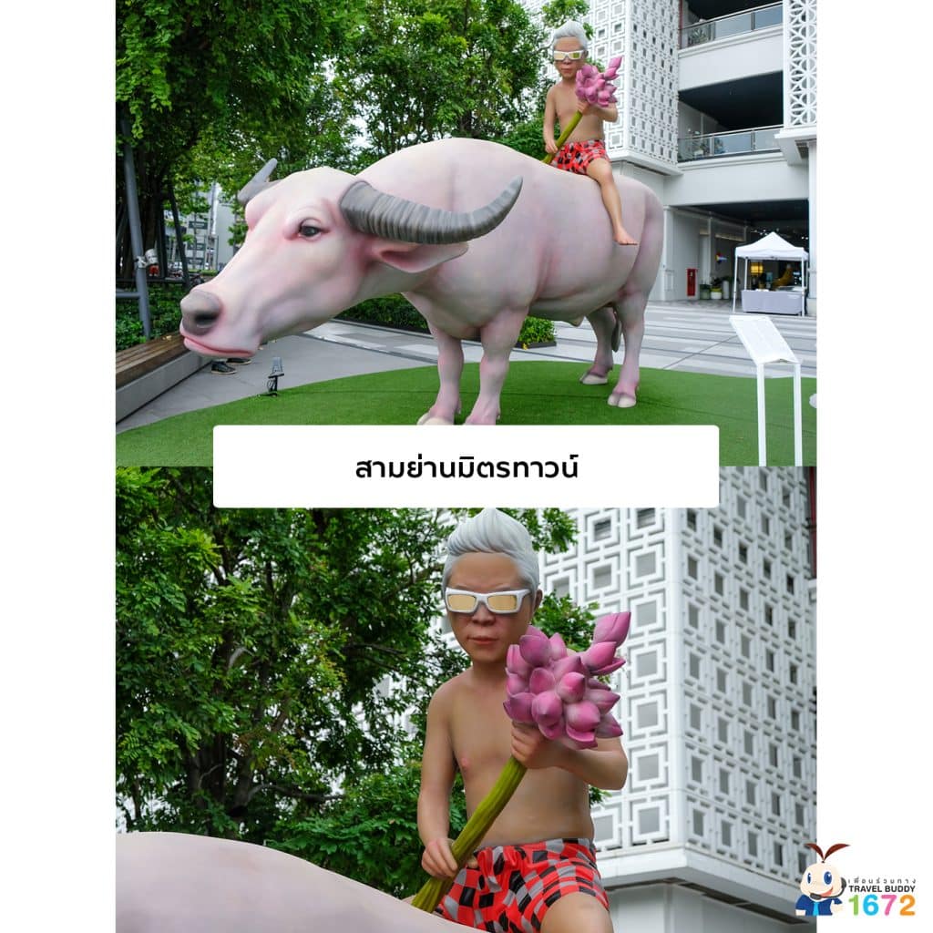 ประติมากรรมควายเผือกและมีเด็กเลี้ยงควายถือดอกบัว โดยถ่ายทอดเรื่องราวของเด็กชายเลี้ยงควายอีสานในยุคสมัยใหม่ สะท้อนความเป็นอีสาน นำความผูกพันระหว่างควายกับคนมาสะท้อนเรื่องราวต่าง ๆ ในสังคมนั่นเอง