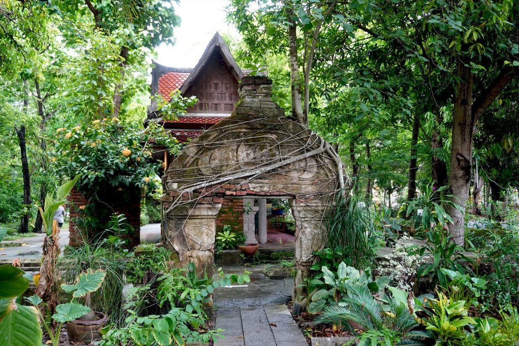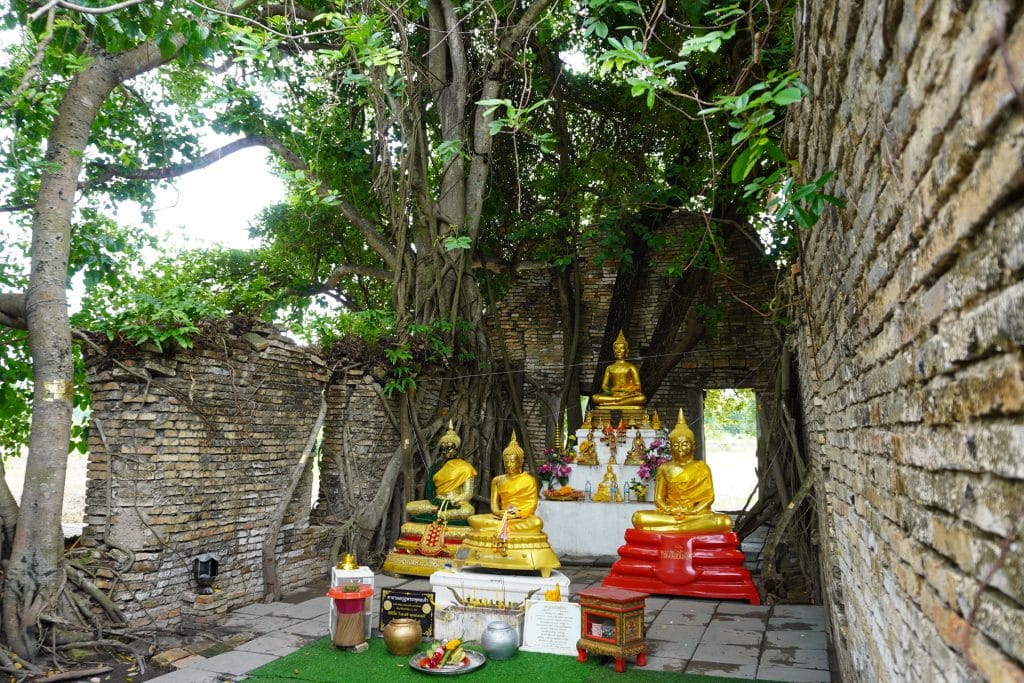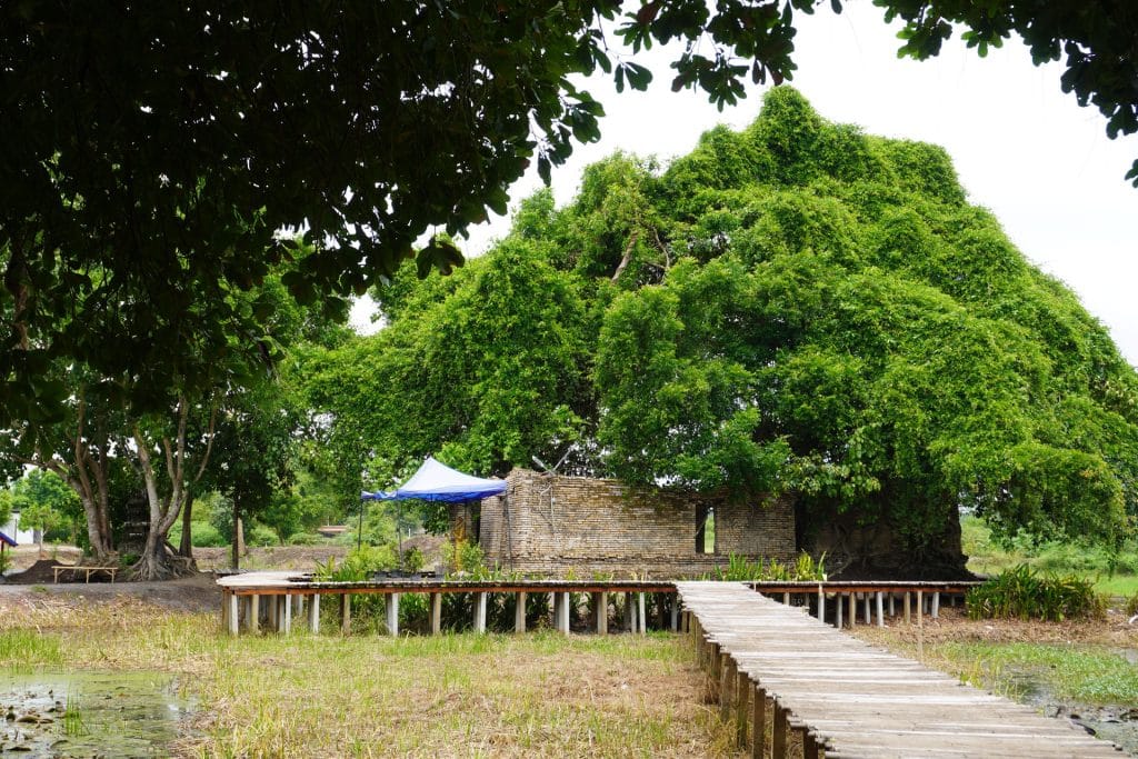 ตัวโบสถ์จะถูกโอบล้อมด้วยต้นโพธิ์เก่าต้นใหญ่ มีรากของต้นโพธ์เลื้อยไปรอบ ๆ และยึดเกาะตัวโบสถ์เอา ไว้ไม่ให้พังทลายไปตามกาลเวลา ดูสวยงามและเข้มขลัง มีสะพานไม้ที่สามารถเดินชมได้โดยรอบ