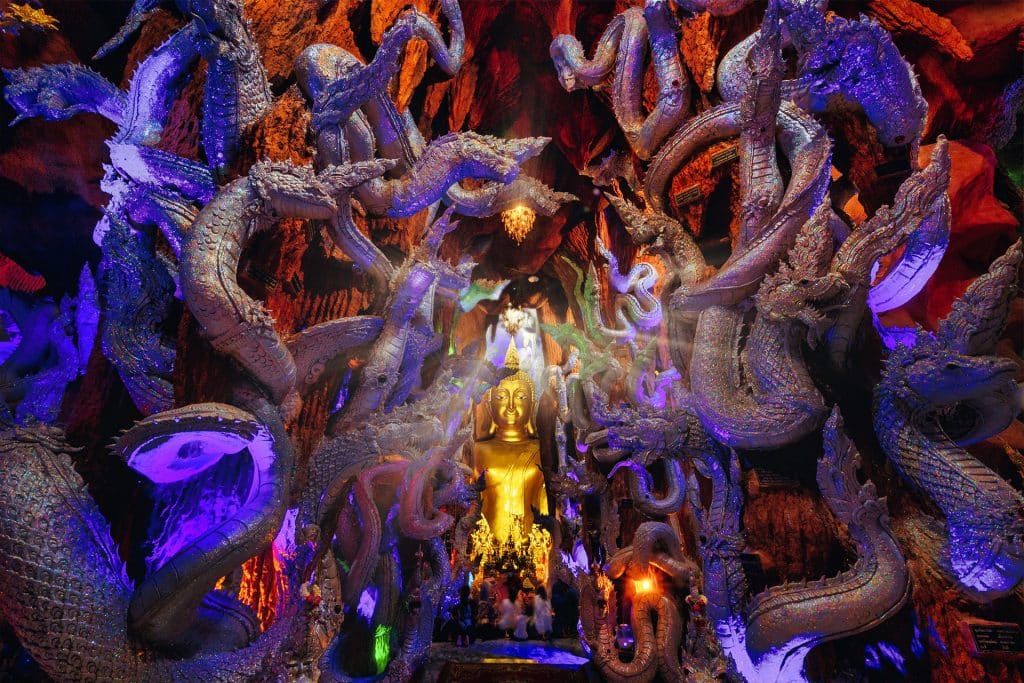 ภายในถ้ำประดับตกแต่งด้วยแสงไฟหลากสี มีองค์พญานาคจำลองหลากหลาย มีพระพุทธรูปองค์ใหญ่สีทอง มีหุ่นขี้ผึ้งจำลองของพระเกจิอาจารย์ เช่น พระพุฒจารย์ (โต พรหมรังสี) ท่านพุทธทาสภิกขุ หลวงปู่มั่น ครูบาศรีวิชัย มีคลังมหาสมบัติที่เต็มไปด้วย ทอง เพชร พลอยและมุก