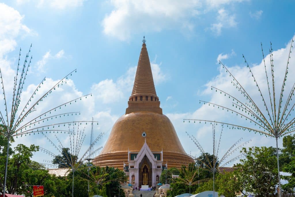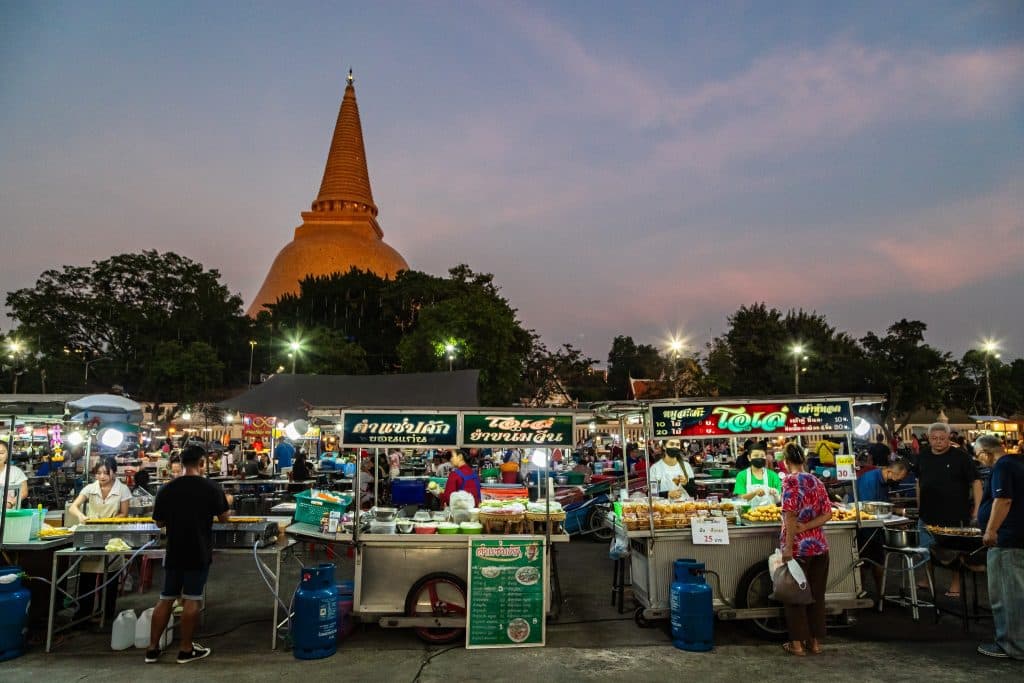 จากนั้น เดินทางไปไหว้พระปฐมเจดีย์และเดินเล่นตลาดโต้รุ่งองค์พระปฐมเจดีย์