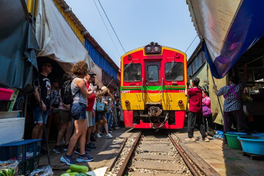 แล้วไปเดินเล่นตลาดร่มหุบ แวะรับประทานอาหารกลางวันบริเวณริมทางรถไฟสถานีแม่กลองได้ รถไฟจะเข้าสถานีเวลา 8.30 น. 11.10 น. 14.30 น. 17.40 น. ออกจากสถานีเวลา 06.20 น. 9.00 น. 11.30 น. 15.30 น.