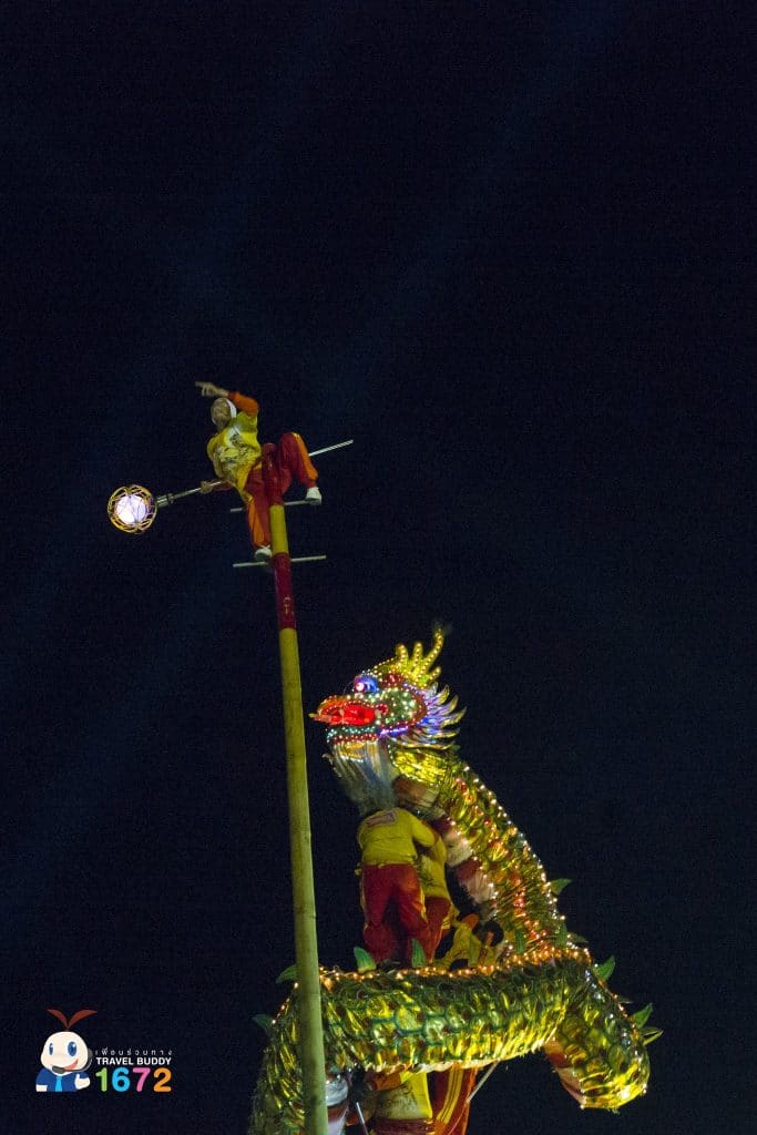 การแสดงของมังกรแห่กลางคืนจะมีการพ่นไฟ (จุดพลุ)
