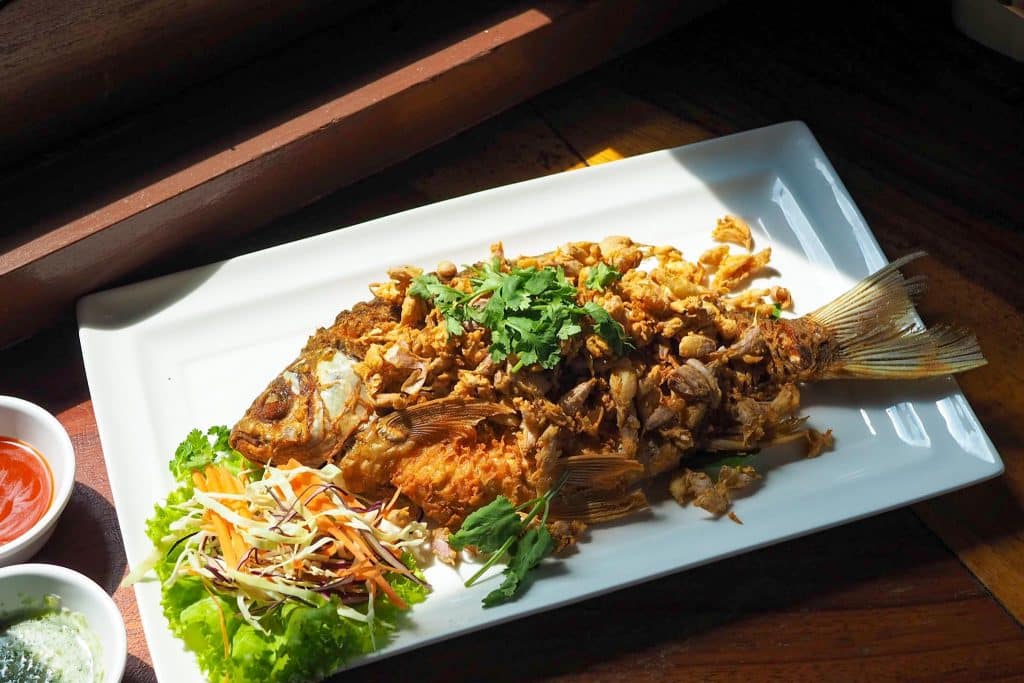 นอกจากเรื่องวิวที่เด่นแล้ว เรื่องอาหารก็น่ากินไม่แพ้กัน ไม่ว่าจะเป็น ยำใบชะพลูทอด แกงส้มชะอมกุ้งตัวโต ๆ ไก่ผัดเม็ดมะม่วง น่ากินไปหมดเลย เที่ยวตามรอยละครพรหมลิขิตทั้งที ก็ขอกินตามด้วยแล้วกันกับเมนู ‘ปลาตะเพียนทอดกระเทียม’