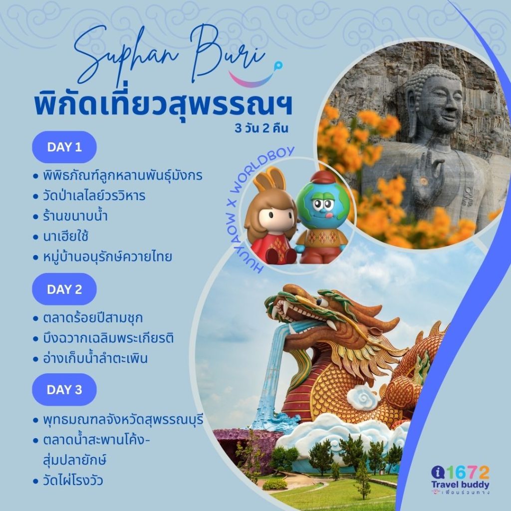 ติดตามบัดดี้เพื่อลุ้นรับน้อง Huuyaow กับน้อง Worldboy แล้ว มาอัปเดตพิกัดที่เที่ยว (Must Seek & Must See) ที่กิน (Must Taste) ที่ชอป (Must Buy) รวมทั้งที่แชะภาพสวย ๆ ของเมืองสุพรรณฯ ไปพร้อมกันเลย ✨