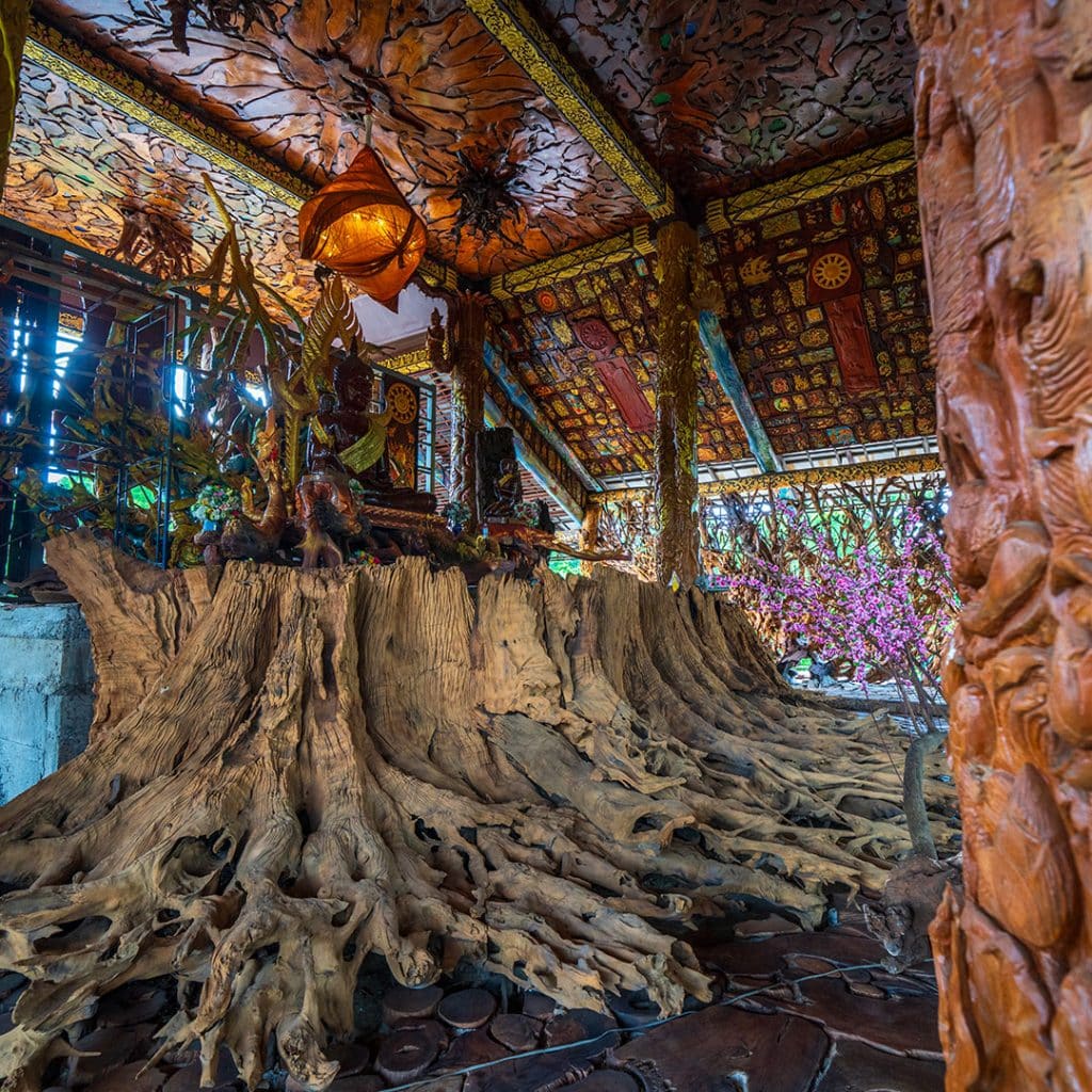 ไฮไลต์ของวัดนี้ คือพระอุโบสถรากไม้ ที่เกิดจากการนำรากไม้กันเกรามาทำเป็นฝาผนัง ดูสวยแปลกตา แถมยังมีลมพัดผ่านเข้ามาเรื่อย ๆ ทำให้อากาศถ่ายเท เย็นสบาย พระประธานและท้าวเวสสุวรรณคู่หน้าพระอุโบสถทำจากไม้ตะเคียนทอง สวยงามอลังการไม่แพ้กัน