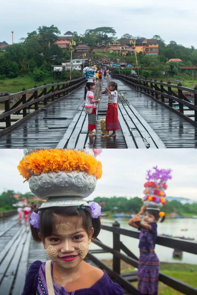 พระจะเดินมาบิณฑบาตรประมาณ 06.30 น. บริเวณเชิงสะพาน ทั้งชาวมอญและนักท่องเที่ยวมากมายจะยืนเรียงแถวอย่างเป็นระเบียบเพื่อใส่บาตร ถือเป็นการเริ่มวันและปิดทริปที่ดีก่อนเดินทางกลับมาทำงานเลยล่ะ