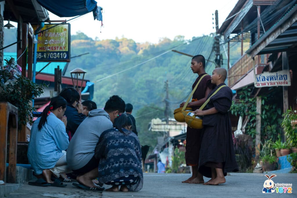 นอกจากนี้ เพื่อน ๆ ยังสามารถเดินเล่นรอบหมู่บ้าน ใส่บาตร เที่ยวตลาดชิมอาหารอร่อย ๆ ยามเช้า หรือแวะชมธารน้ำตกเล็ก ๆ ที่อยู่ภายในหมู่บ้าน