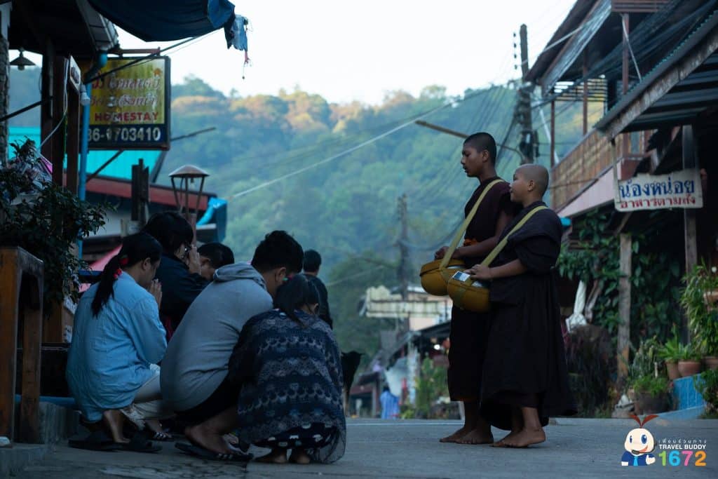 ยามเช้าเพื่อน ๆ ยังสามารถเดินเล่นรอบหมู่บ้าน ใส่บาตร เที่ยวตลาดชิมอาหารพื้นเมืองอร่อย ๆ หรือแวะชมธารน้ำตกเล็ก ๆ ที่อยู่ภายในหมู่บ้าน