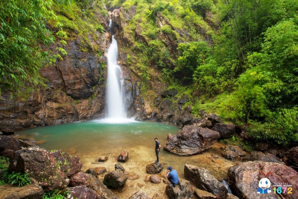 ไม่ไกลจากหมู่บ้านอีต่อง มาเล่นน้ำเย็น ๆ ที่ #น้ำตกจ๊อกกระดิ่น อยู่ห่างจากอุทยานแห่งชาติทองผาภูมิประมาณ 5 กิโลเมตร เป็นน้ำตกชั้นเดียวที่มีน้ำตลอดทั้งปี ไหลจากผาสูงลงสู่พื้นที่มีลักษณะเป็นแอ่งน้ำ หากมองจากระยะไกลจะเห็นเป็นสีเขียวมรกต สวยงาม