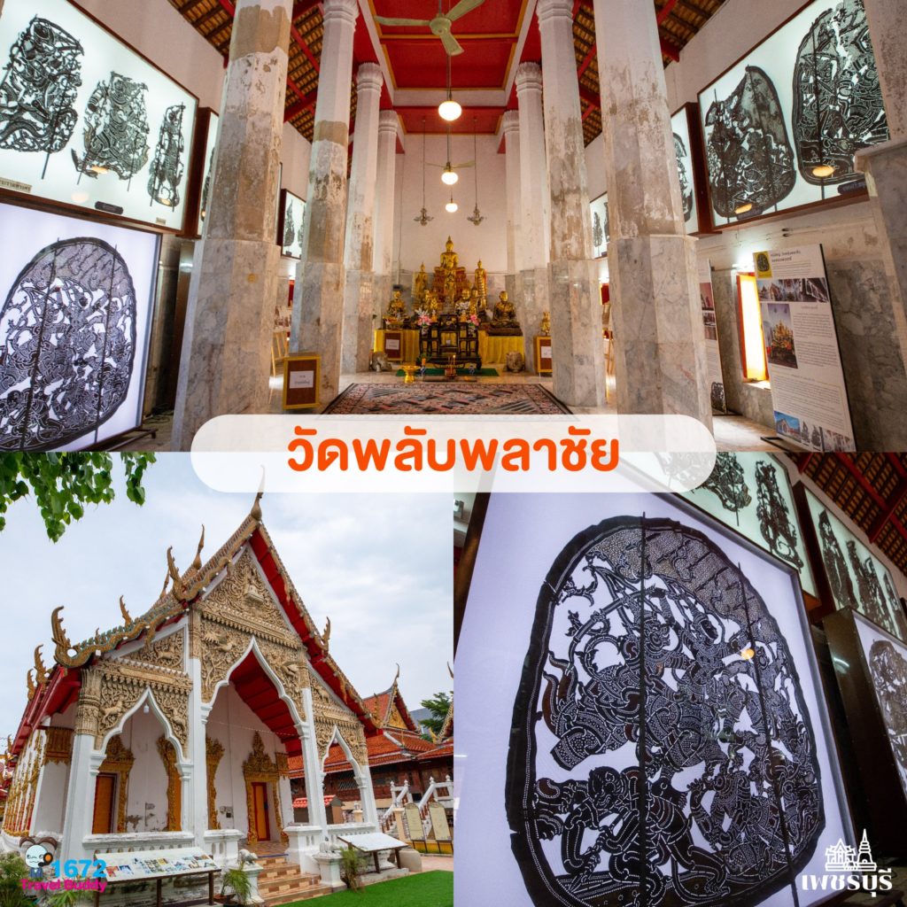 เดินจากวัดมหาธาตุไปนิดเดียวก็จะถึงวัดพลับพลาชัย วัดแห่งนี้ เป็นแหล่งรวมงานศิลปะในสกุลช่างเมืองเพชร ความโดดเด่นอยู่ที่ศิลปะปูนปั้นที่ยังคงมีความสมบูรณ์อยู่มาก โดยเฉพาะที่หน้าบัน จะเห็นปูนปั้นลายก้านขด รูปสัตว์ในป่าหิมพานต์ ที่ลีลาพลิ้วไหวเหมือนจะกระโจนออกมาจากหน้าบันให้ได้ ส่วนภายในพระวิหาร ยังจัดเป็นพิพิธภัณฑ์จัดแสดงหนังใหญ่ที่มีอายุกว่า 100 ปี