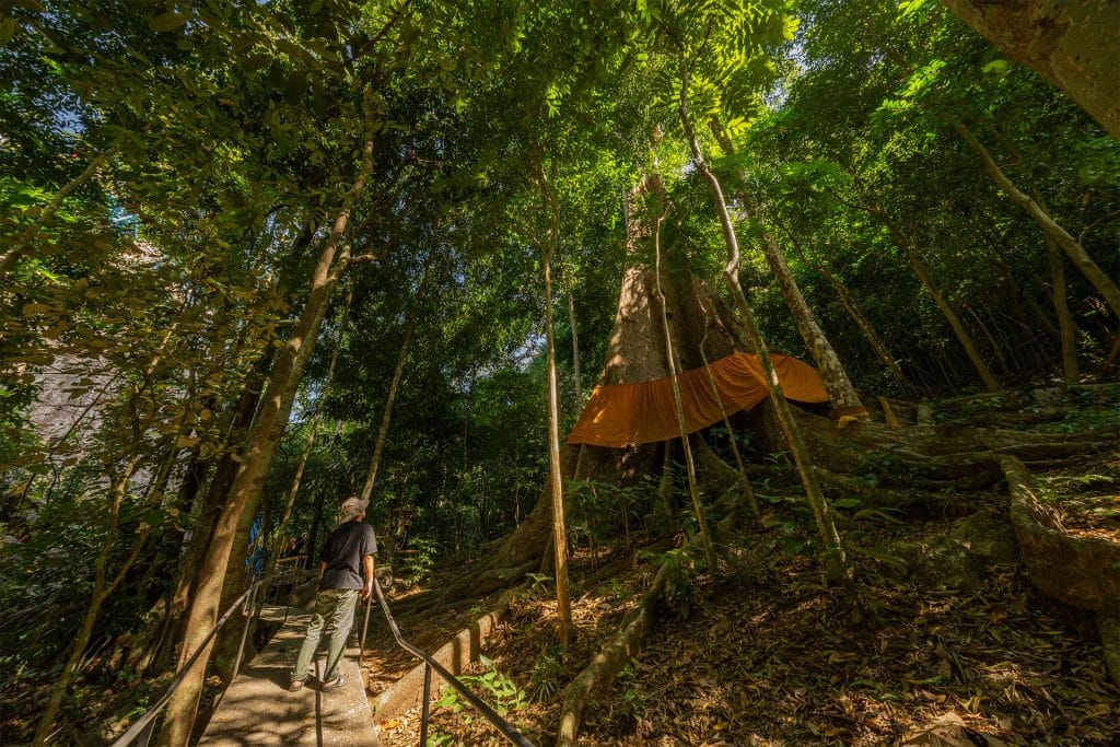 จากลานจอดรถ มีทางเดินชันเล็กน้อยให้เดินขึ้นไปเพื่อชมต้นพระเจ้าห้าพระองค์ โดยชื่อนี้มีที่มาจากผลทรงกลมของต้นไม้ที่หล่นร่วงอยู่ตามพื้น โดยเฉพาะเมล็ดแก่ ที่เมื่อแห้งแล้วจะปรากฏผิวขรุขระและร่องนูนจำนวน 5 พู คล้ายกับพระพุทธรูปหรือพระเครื่ององค์เล็ก 5 องค์หันด้านศีรษะเข้ากันที่จุดศูนย์กลาง เป็นที่มาของชื่อ “พระเจ้าห้าพระองค์” นั่นเอง