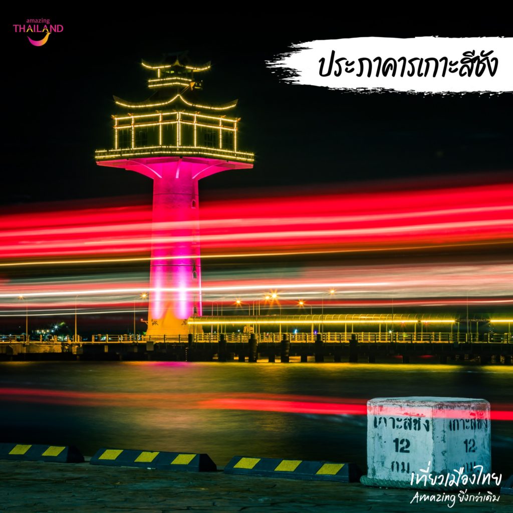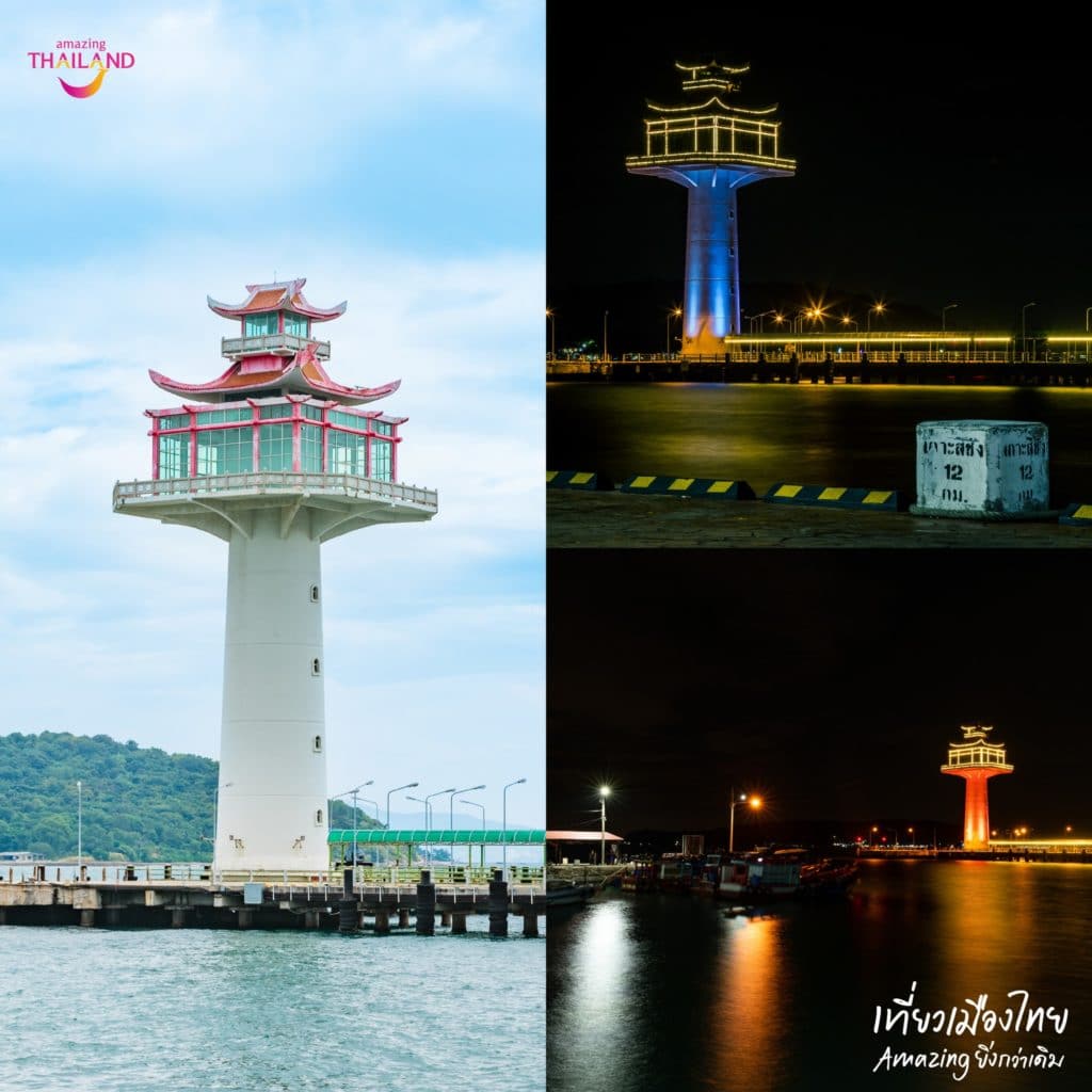 แลนด์มาร์คสำคัญที่บ่งบอกว่าเราเดินทางมาถึงเกาะสีชังแล้ว ด้วยลักษณะพิเศษของประภาคารที่มีเก๋งจีนอยู่ด้านบน ในตอนเย็นจะมีการเปิดไฟด้วย สีสันสวยงาม ห้ามพลาดเด็ดขาด