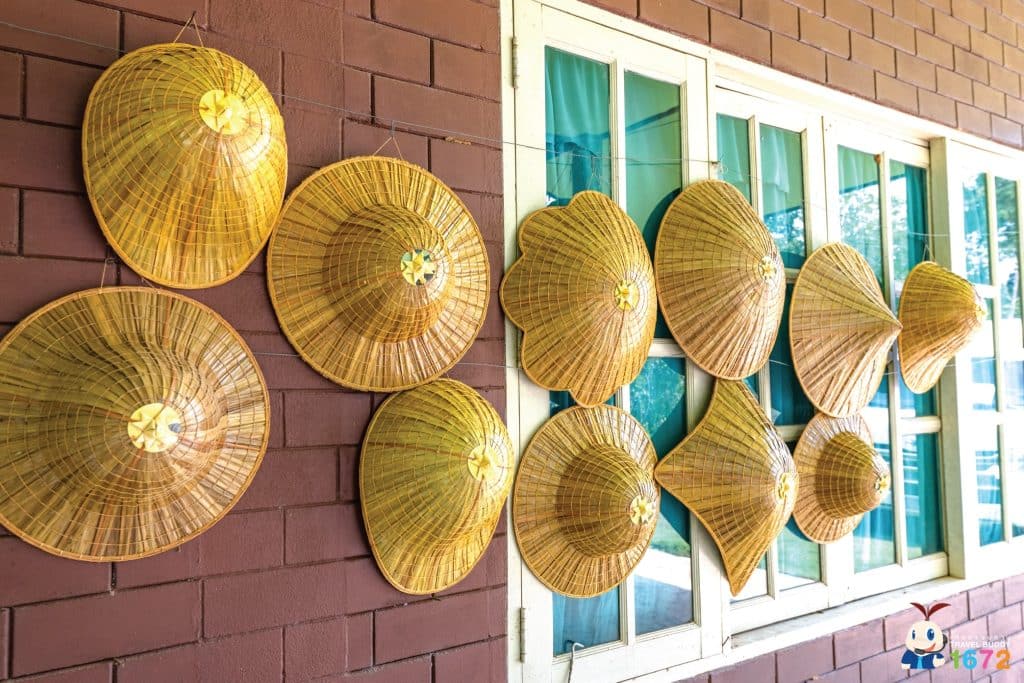 อีกหนึ่งกิจกรรมไฮไลต์ คือ เรียนรู้ภูมิปัญญาหัตถกรรมจักสานงอบใบจากและสานคลุ้ม ซึ่งถือว่าเป็นอาชีพที่สร้างรายได้ให้กับคนในชุมชนเลยก็ว่าได้ค่ะ โดยเฉพาะหมวกใบจาก หรือ เหละ ผลิตภัณฑ์จักสานที่สร้างชื่อเสียงให้กับชาวบ้าน เป็นศิลปหัตถกรรมพื้นบ้านที่สืบต่อกันมากว่าร้อยปี เหมาะสำหรับใช้กันแดด กันฝน สำหรับชาวสวน ชาวนา คนทั่วไปก็อุดหนุนมาใส่ได้เหมือนกันนะคะ นอกจากนี้ก็ยังมีสานข้าวของเครื่องใช้อีกหลาย ๆ รูปแบบ เช่น พัด พวงกุญแจ เป็นต้น