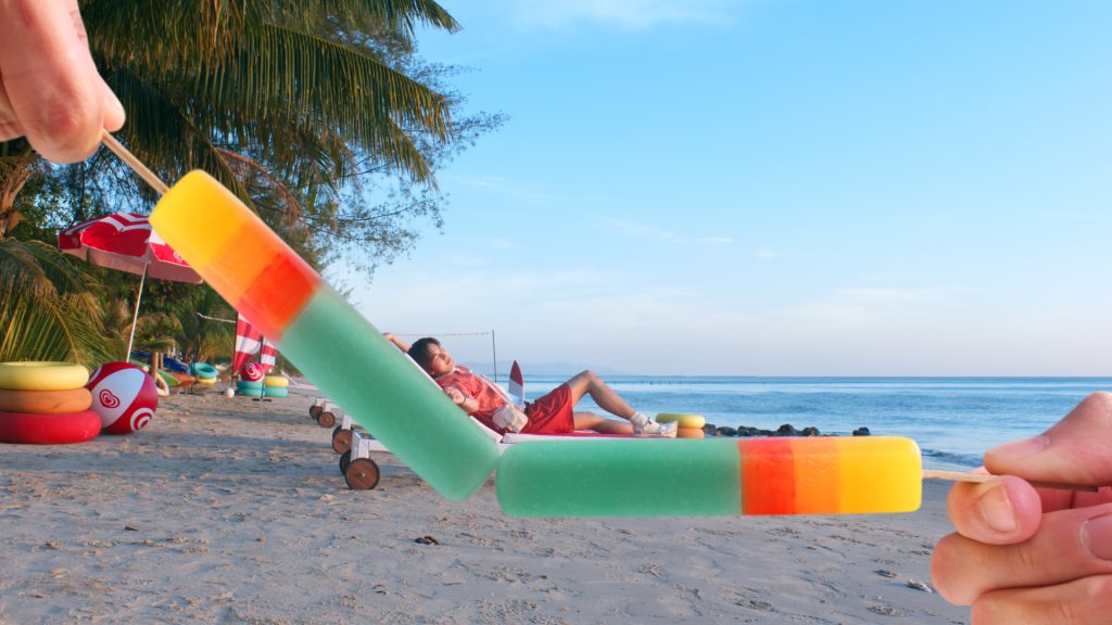 นำไอศกรีมวอลล์มาต่อกันเป็นรูปเตียงชายหาดก็ดูสดใส หรือจะเนรมิตให้ไอศกรีมวอลล์เป็นต้นมะพร้าวก็ย่อมได้~