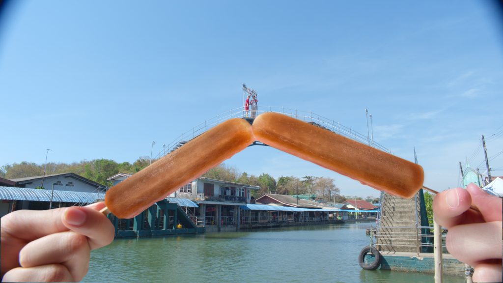 ทริคถ่ายรูปสุดคูล นำไอศกรีมวอลล์มาต่อกันเป็นรูปสะพานวัดใจ ซึ่งเป็นแลนด์มาร์กของ วิสาหกิจชุมชนท่องเที่ยวบ้านน้ำเชี่ยว
