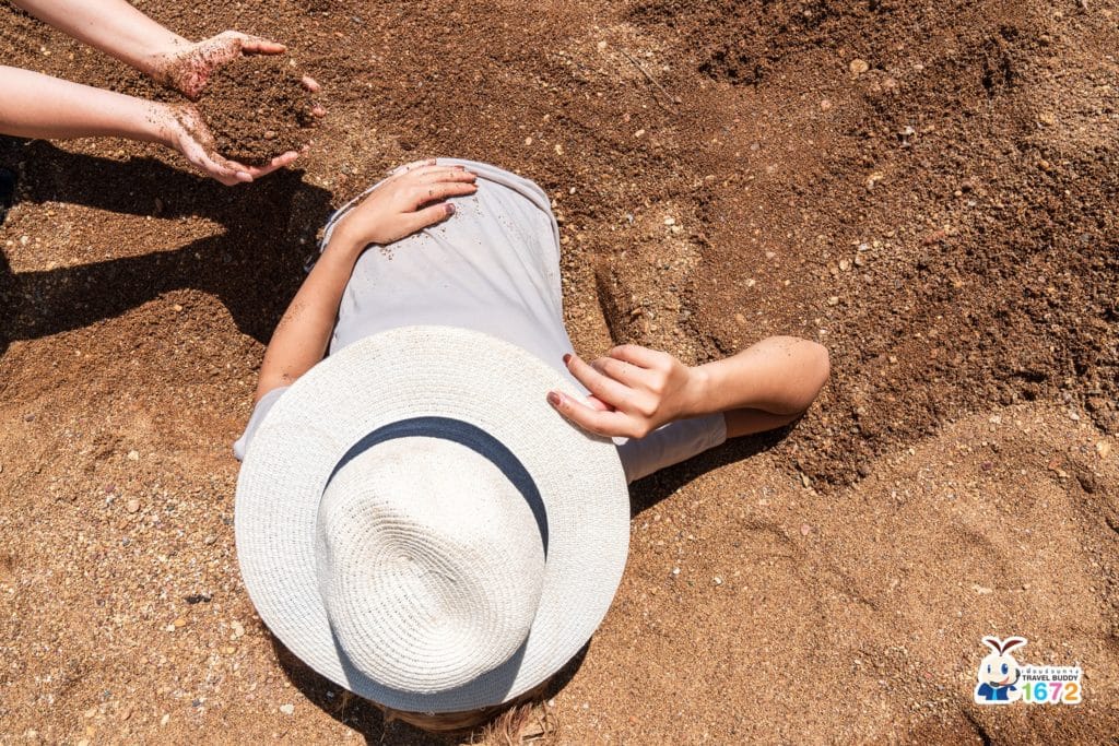 หลังทำผ้ามัดย้อมแล้ว ไปผ่อนคลายกันสักหน่อยด้วยการทำสปาทรายแดง หรือหมกทรายแดงนั่นเองค่ะ วิธีการคือขุดทรายให้เป็นร่องพอให้ลงไปนอนได้ จากนั้นนำทรายกลบตัวเราจนเหลือแต่ศีรษะ ใช้เวลาประมาณ 20-30 นาที การหมกทรายแดงนี้จะช่วยบรรเทาอาการปวดเมื่อย ช่วยเรื่องมือชา เท้าชา ได้อีกด้วย