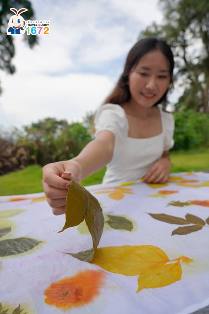 นอกจากผ้ามัดย้อม 3 ป่าแล้ว ที่นี่ยังมี Eco-print ผ้าพิมพ์ลายธรรมชาติ เพื่อน ๆ สามารถออกแบบลายผ้าของตัวเองได้เช่นเดียวกับผ้ามัดย้อม ลวดลายก็จะแตกต่างกันไปตามใบไม้ ดอกไม้ ที่เราเลือกเอง
