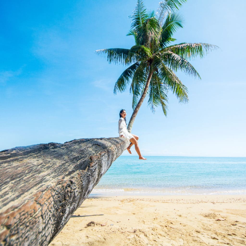 ⛱️ ถ่ายรูปคู่ต้นมะพร้าวเอนเกือบถึงพื้น ยื่นไปทางทะเล บริเวณหน้าหาด