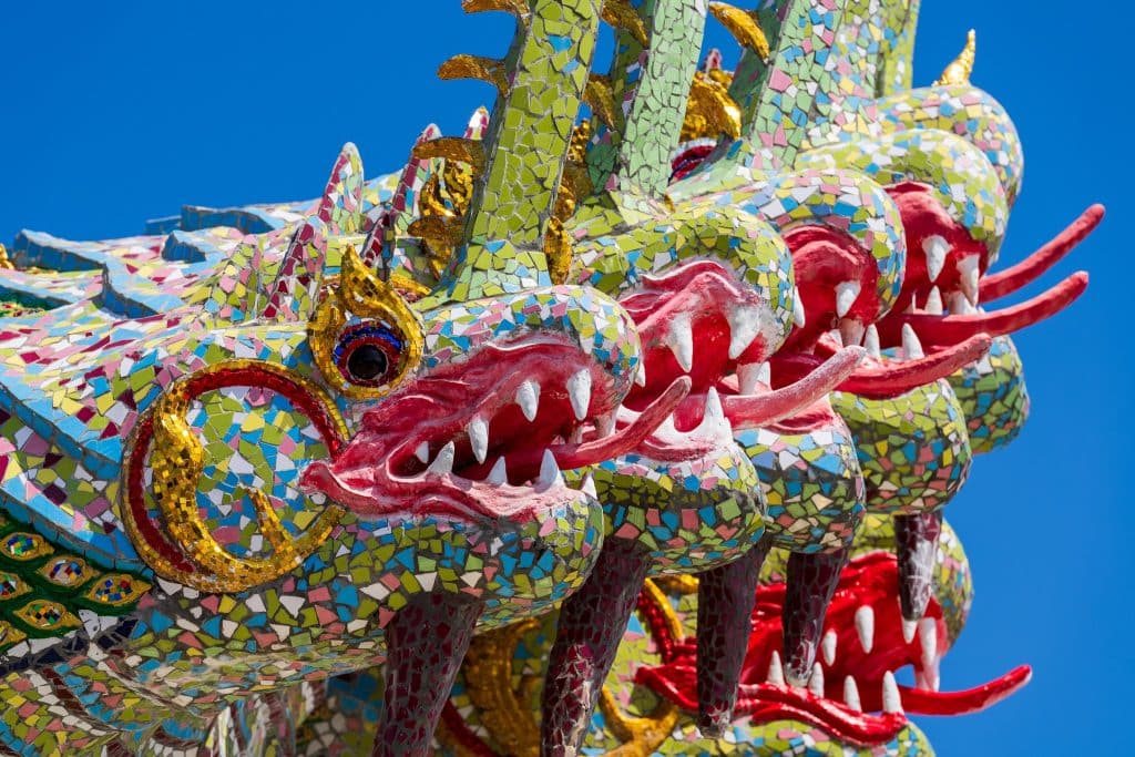 - เจดีย์กระจกแก้ว เจดีย์ขนาดใหญ่ที่มีพญานาคโอบรอบตัวเจดีย์ 1 คู่ หน้าประตูมีพญางู 1 คู่และพระพุทธเจ้า 5 พระองค์ประดิษฐานอยู่ ภายในบอกเล่าประวัติของพระพุทธเจ้า