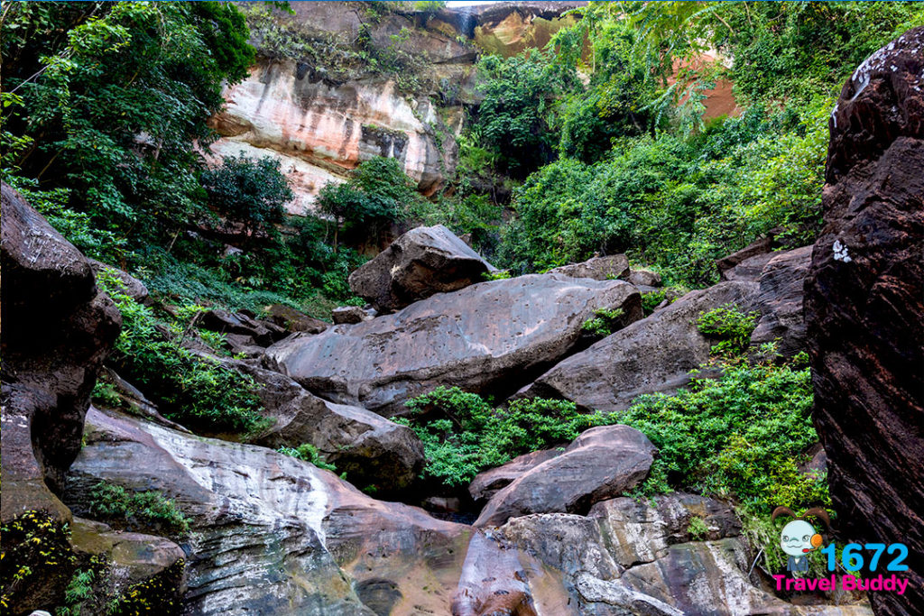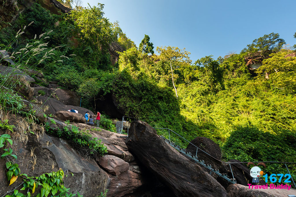 จากนั้นจะเป็นเส้นทางเดินป่า ระยะทางประมาณ 500 เมตร ซึ่งเส้นทางนี้เป็นเส้นทางธรรมชาติต้องใช้ความระมัดระวังในการเดินพอสมควร ซึ่งช่วงที่ลาดชัน ทางอุทยานฯ มีการขึงเชือกไว้ให้จับ สลับกับมีบันไดเล็ก ๆ ให้ปีนเป็นระยะ ๆ เพื่ออำนวยความสะดวกในการเดินขึ้นไปนั่นเอง