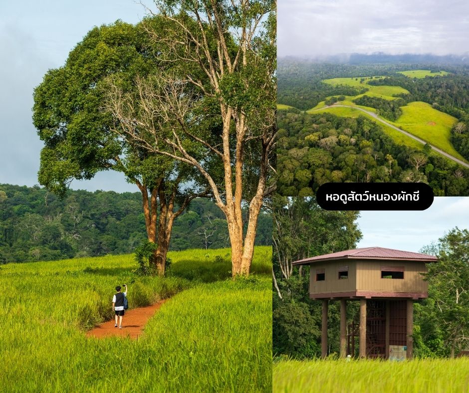 หอดูสัตว์หนองผักชี เป็นอีกหนึ่งสถานที่ที่ได้รับความนิยมจากนักท่องเที่ยวสายธรรมชาติ โดยจุดเริ่มต้นเส้นทางเดินอยู่ริมถนนธนะรัชต์ กิโลเมตรที่ 33 และต้องเดินเท้าตัดเข้าสู่ป่าดิบแล้งที่มีต้นไม้ขนาดใหญ่ขึ้นเรียงรายอยู่ทั่วไป ผ่านกลุ่มต้นยางเสียน ต้นไทรใหญ่ รังนกเงือก ออกสู่ทุ่งหญ้า ผ่านโป่งสัตว์ริมหนองน้ำจนถึงหอดูสัตว์หนองผักชี บนหอดูสัตว์หนองผักชีจะมองเห็นทัศนียภาพของผืนป่าและทุ่งหญ้าได้รอบทิศ รวมทั้งหนองผักชีซึ่งเป็นแหล่งน้ำสำคัญของสัตว์ป่าในบริเวณนั้น จากหอดูสัตว์เดินตามถนนลูกรังออกสู่ถนนธนะรัชต์ กิโลเมตรที่ 35 รวมระยะทางเดินประมาณ 3.5 กิโลเมตร ใช้เวลาเดินราว 2-3 ชั่วโมง 🌿