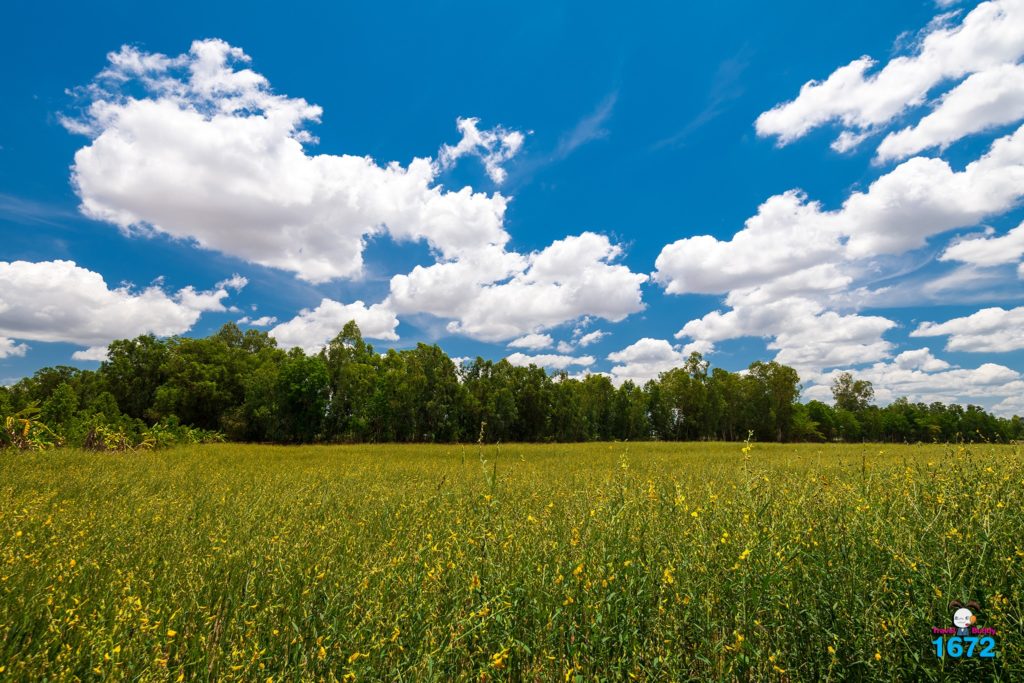 รอบ ๆ บริเวณนี้เป็นทุ่งนา หากใครมาไม่ทันช่วงที่ทุ่งนาเขียวขจี ก็ไม่ต้องเสียใจไปนะ ยังมีทุ่งปอเทืองที่ปลูกไว้หลังเก็บเกี่ยวให้เพื่อน ๆ ได้ชม ถ่ายรูปสวย ๆ และยังมีจักรยานให้ยืมปั่นฟรีด้วยนะ