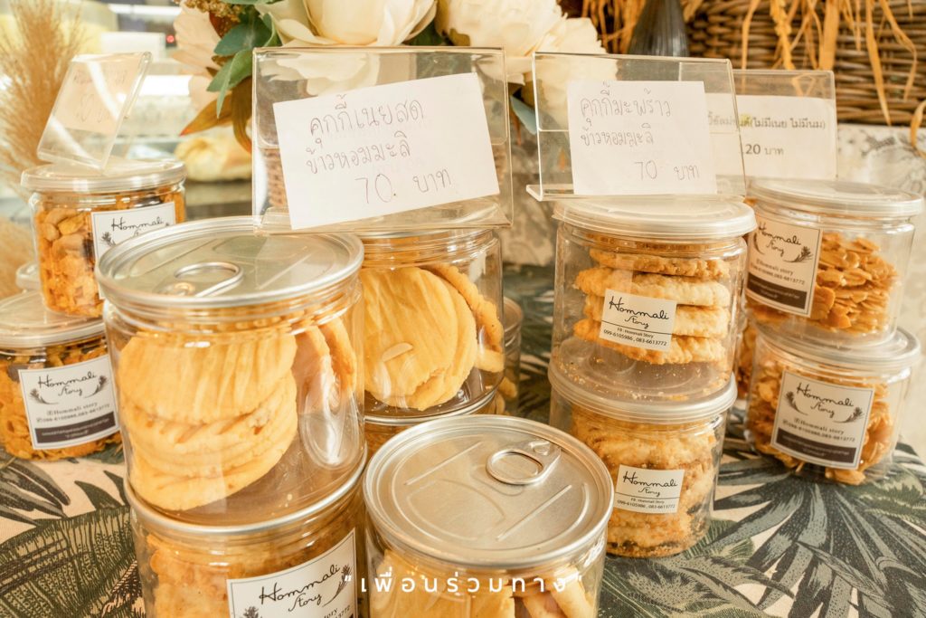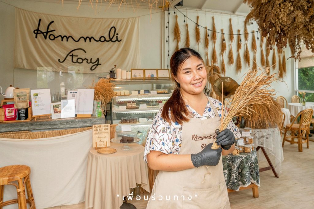 ภูมิ กองทุ่งมน แห่ง ‘Hommali Cafe’ ลูกร้อยเอ็ดที่ทดลองทำธุรกิจมาหลากหลายแขนง จึงหยิบแป้งข้าวหอมมะลิ ผลิตภัณฑ์ขึ้นชื่อจากกลุ่มวิสาหกิจชุมชนมาต่อยอด ผสานกับทักษะการทำขนมอบแบบฝรั่งที่เจ้าตัวไปเรียนมา ลองผิดลองถูกจนได้สูตรเบเกอรีแป้งข้าวหอมมะลิ เคล็ดลับเฉพาะหอมมะลิคาเฟ่เท่านั้น