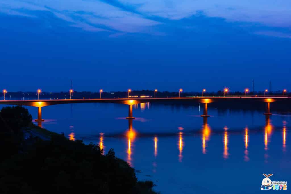 ช่วงพลบค่ำ เพื่อน ๆ จะได้เห็นแสงไฟจากสะพานกระทบกับผิวน้ำ สวยไปคนละแบบกับช่วงกลางวัน นอกจากนี้ บริเวณรอบ ๆ ยังมีร้านอาหารหลายร้านให้เราได้เลือกดื่มด่ำกับบรรยากาศมื้อค่ำและวิวแม่น้ำโขงอีกด้วย