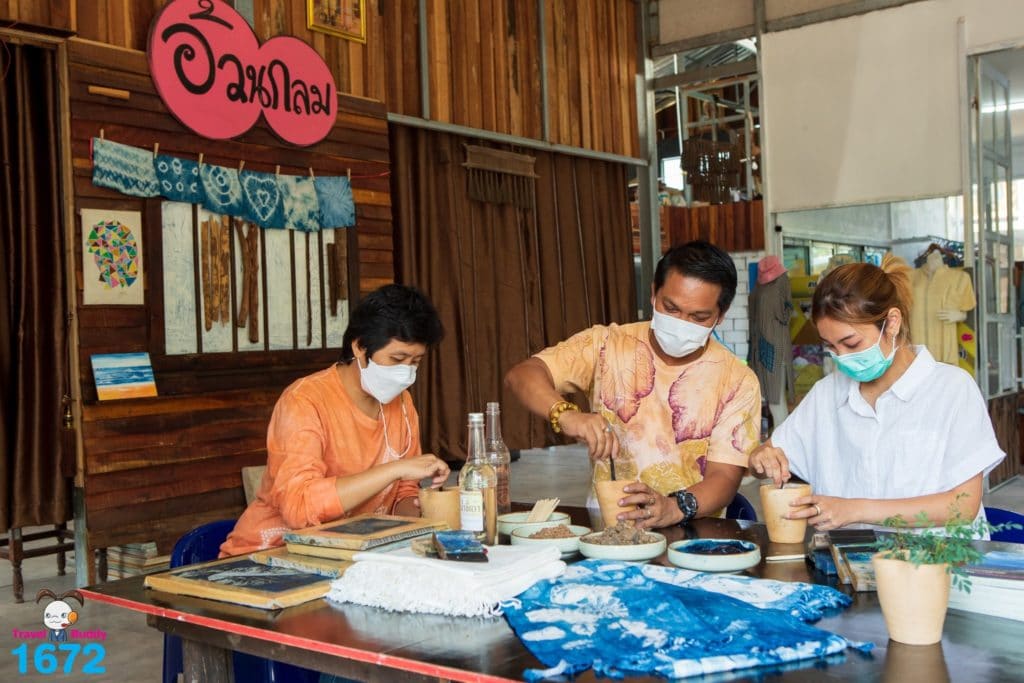 ขั้นตอนการย้อมครามนี้สนุกสุด ๆ แต่ต้องระวังเปื้อนกันด้วยน้า ตลอดการเวิร์กช็อป อาจารย์เนศและอาจารย์หยก จะคอยแนะนำและบอกเล่าความรู้ของการย้อมครามให้เราได้ฟังกัน