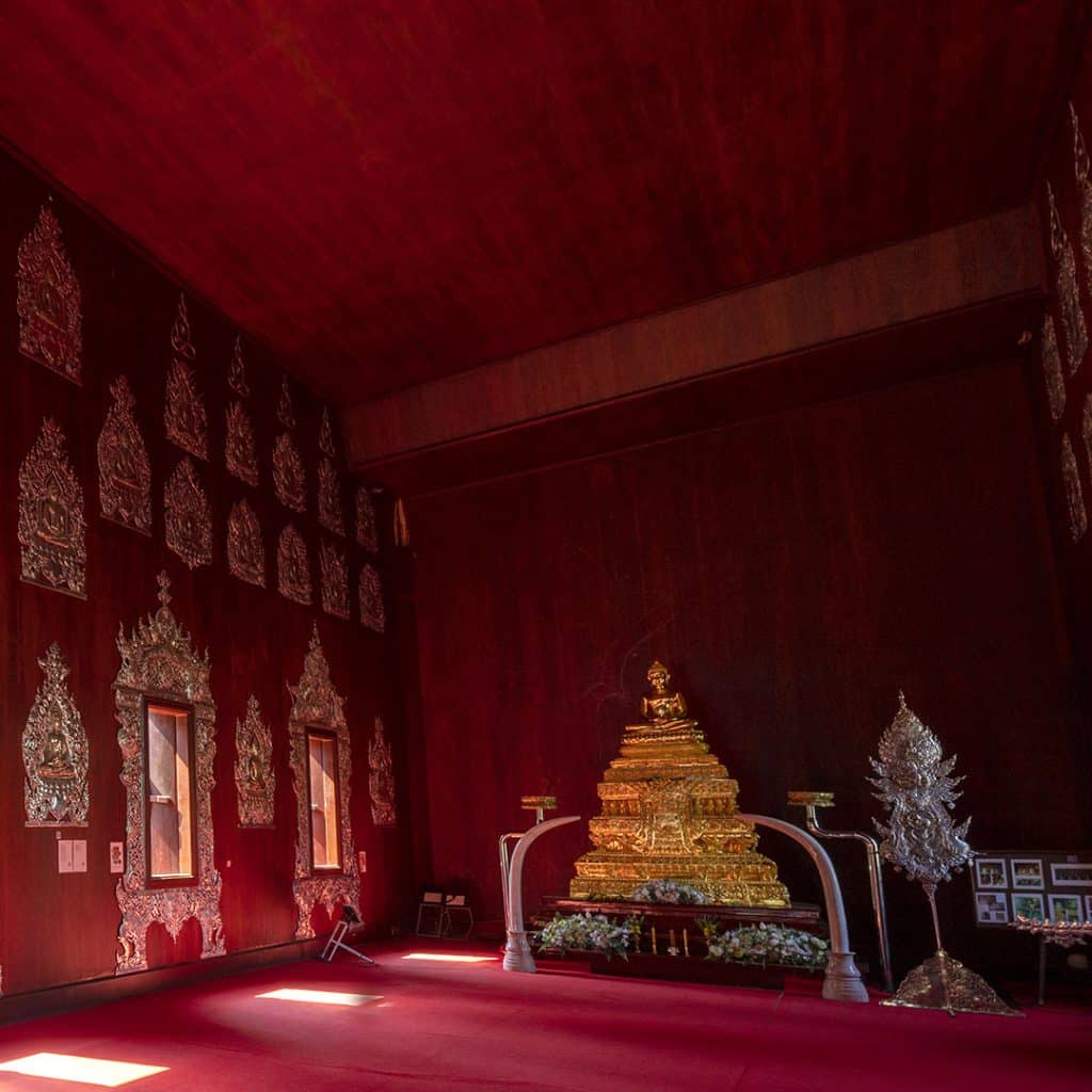 ภายในพระอุโบสถ เป็นโถงโล่งกว้างกรุด้วยไม้ตะเคียนทั้งหลัง เป็นที่ประดิษฐาน “พระพุทธเจ้าเงินไหลมา” พระประธานเนื้อเงินแท้แบบพระพุทธสิหิงค์ พระพุทธเจ้าเงินเคลือบทองคำขาว ใส่ดวงเนตรทับทิมและทองคำ เพื่อให้พระภิกษุและพุทธศาสนิกชน ได้กราบไหว้บูชาเพื่อความเป็นสิริมงคลแก่ตนเองและครอบครัว