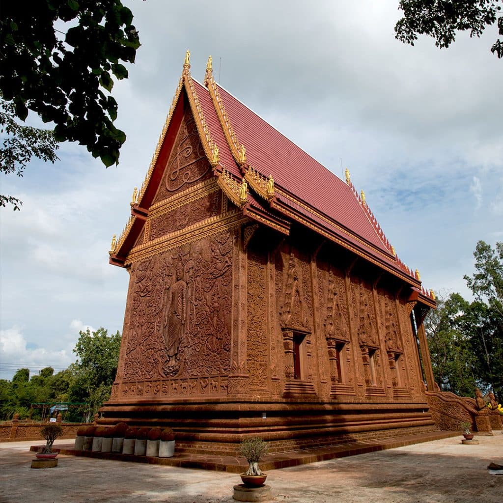 เมื่อเข้ามาภายในบริเวณวัด เพื่อน ๆ จะมองเห็น “อุโบสถศิลาแลง” สีสวย ที่ตั้งอยู่อย่างโดดเด่น ล้อมรอบด้วยกำแพงที่สร้างด้วยศิลาแลงเช่นกัน บริเวณกำแพงรอบโบสถ์แกะสลักเป็นคติสอนธรรมและพุทธประวัติ